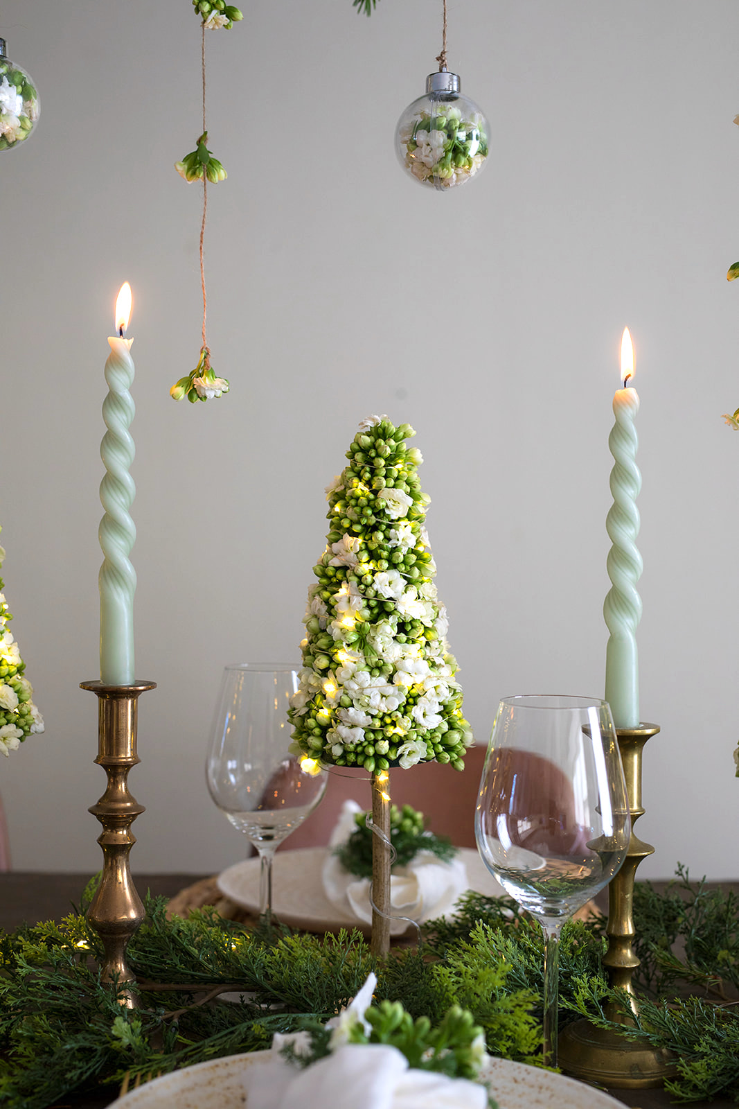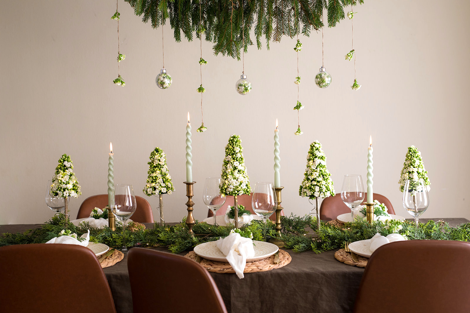 Med denne nemme DIY kan du lave skønne, blomstrende juletræer, som kan pynte både på julebordet eller rundt om i hjemmet. Perfekt til at drysse en god portion julemagi over din bolig. Vi har valgt at bruge hvide blomster, i vores fine opsætning, men du kan mikse og matche farverne lige, som du vil, så du skaber præcis det udtryk, der passer til din jul.