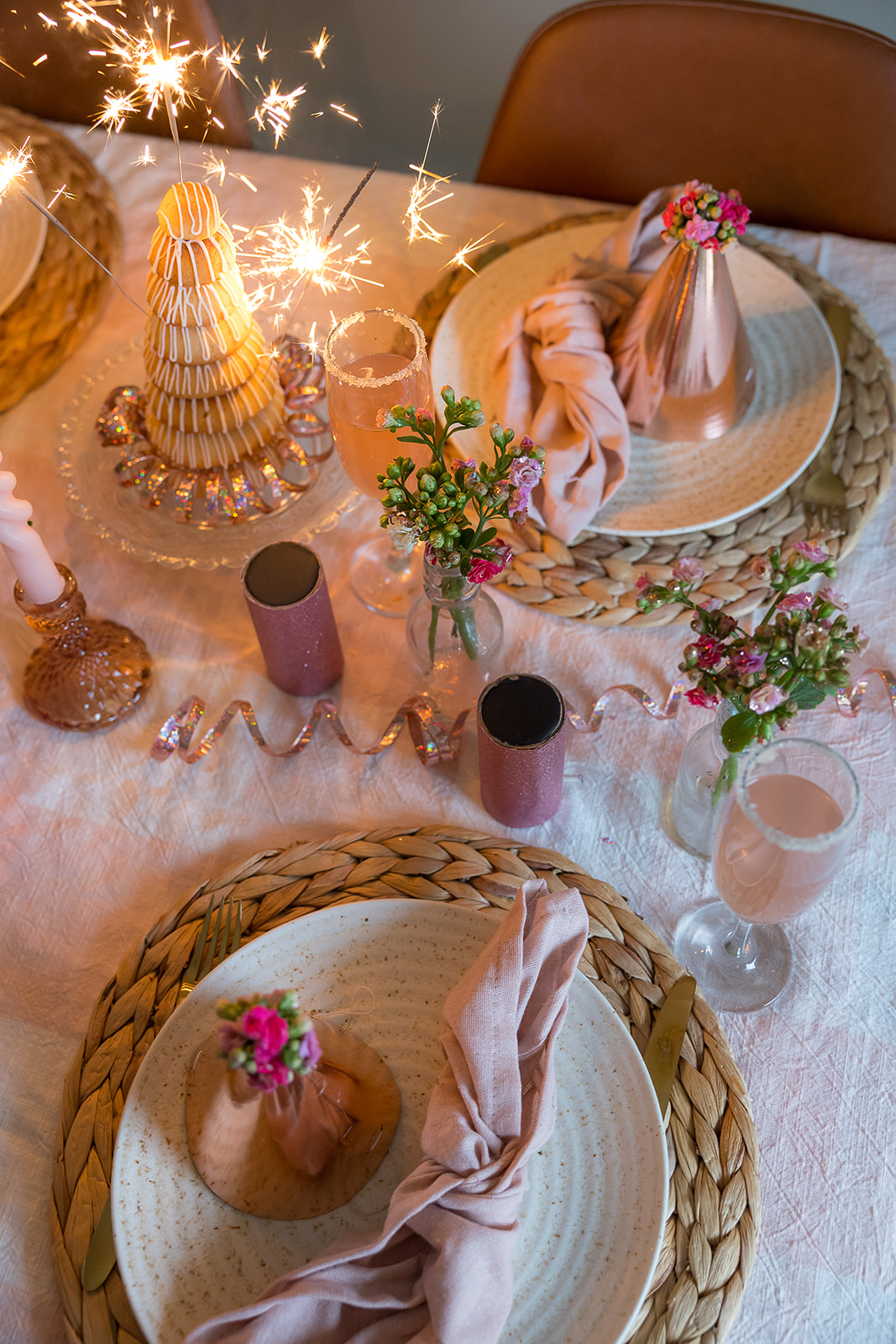 Pynt til selve bordbomben. Her har vi valgt lyserødt glimmerpapir.
