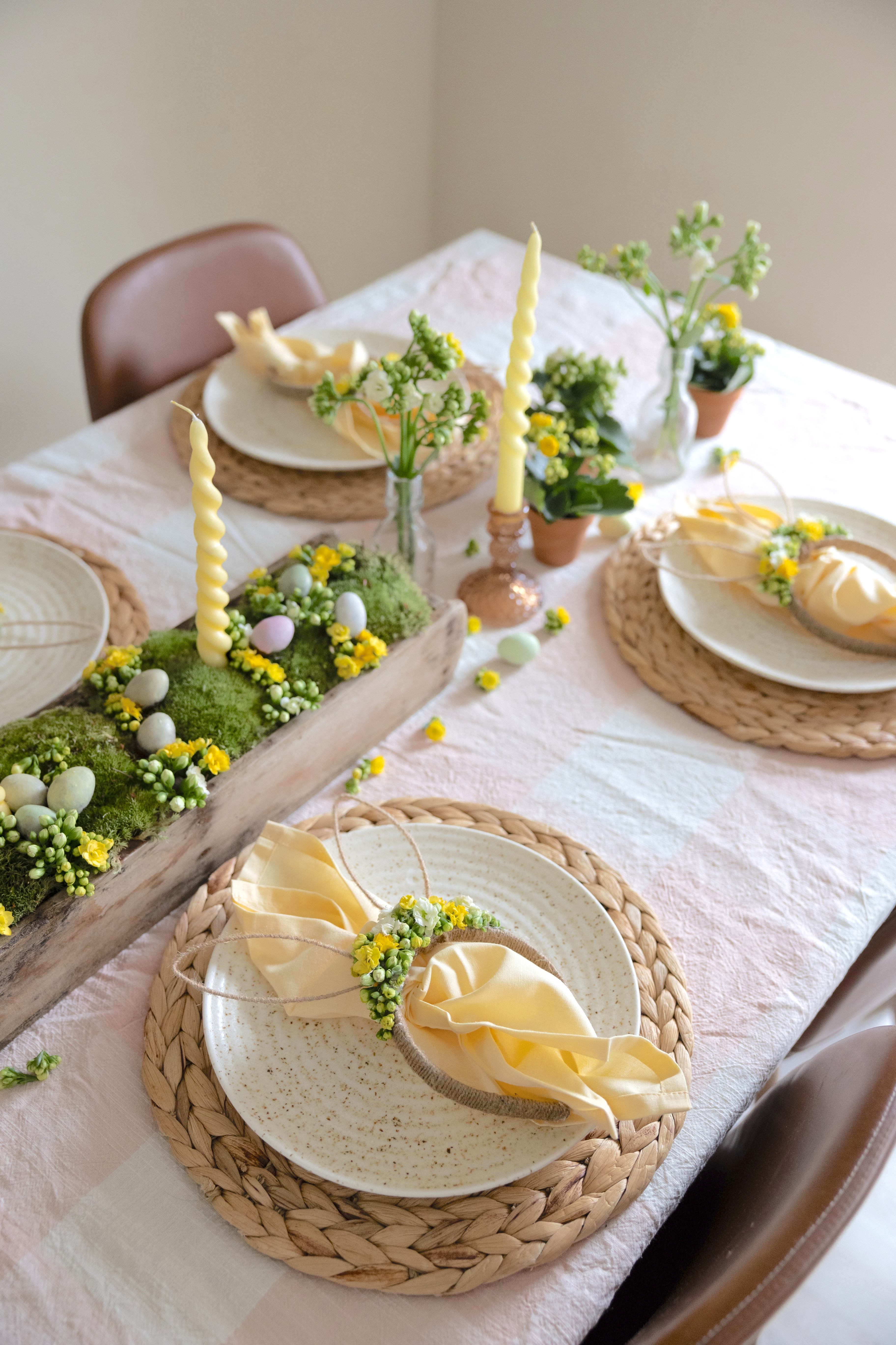 Til et påskebord hører uden tvivl smukke påskeblomster. Dæk et flot og enkelt et af slagsen med vores mini potteplanter i fine skjulere eller en flot påskebuket på bordet. Brug lyse farver, let tekstil og fine krystalglas til at skabe et forårsagtigt udtryk. Ligeledes kan du pynte bordet med påskedekorationer i form af pustede, håndmalede æg eller små blomsterstilke som servietpynt.