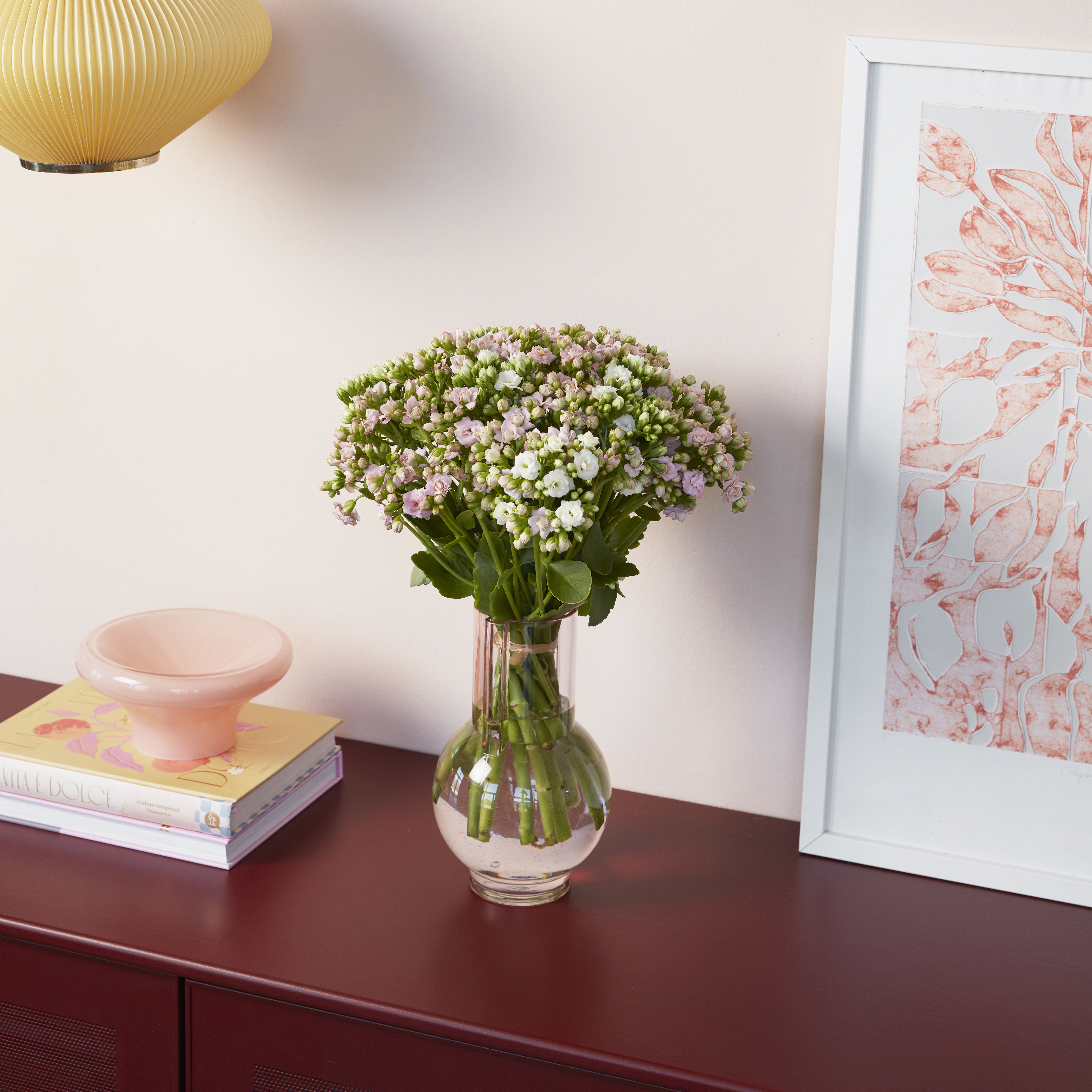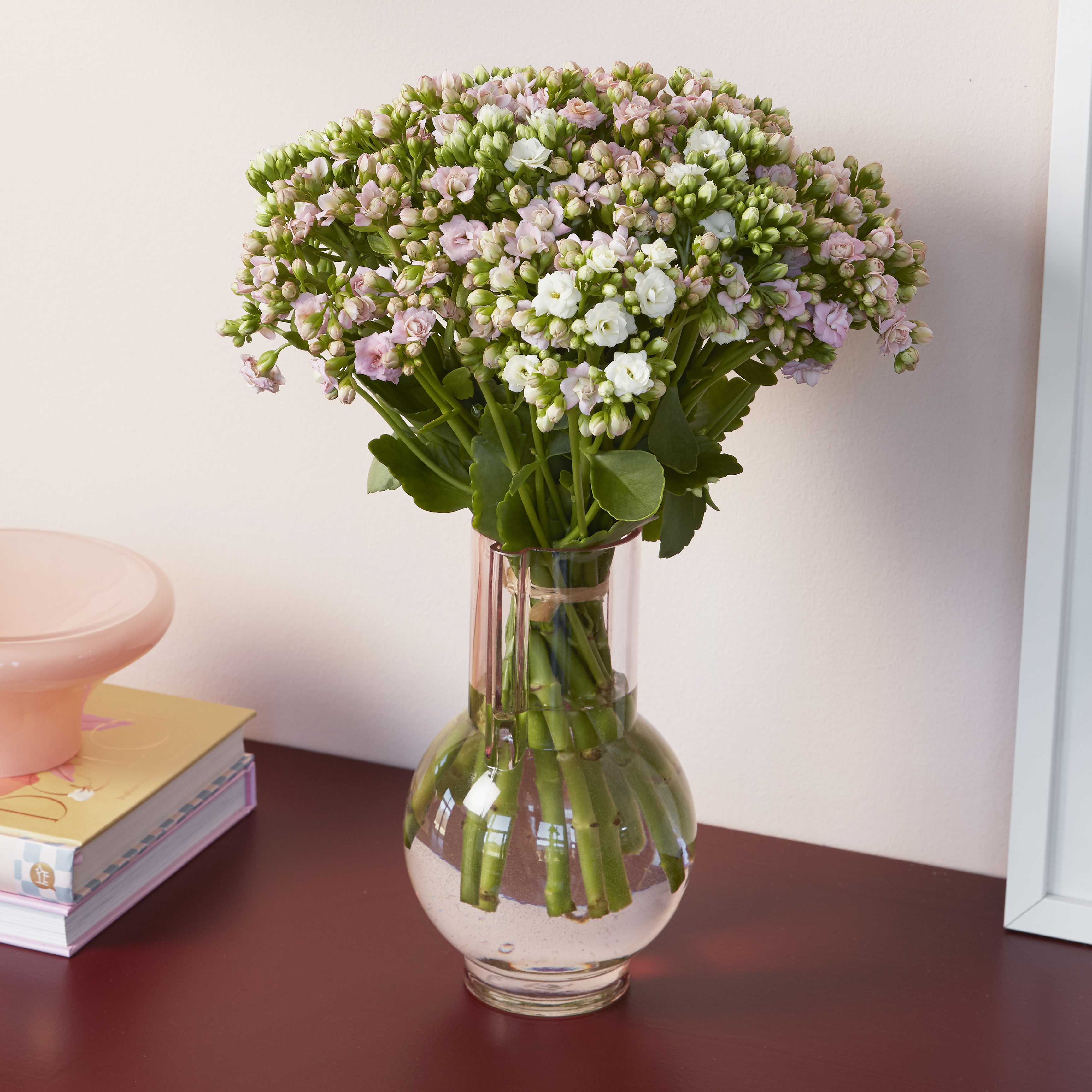 Vores smukke luksusbuket Delicate Grace består af 12 stilke kalanchoe i farverne hvid og rosa. Den er håndbundet, så du kan sætte den direkte i vasen derhjemme. Vi garanterer, at den her vil blomstre smukt i mindst 3 uger. Blomsternes farvenuancer kan variere en smule i forhold til billedet.