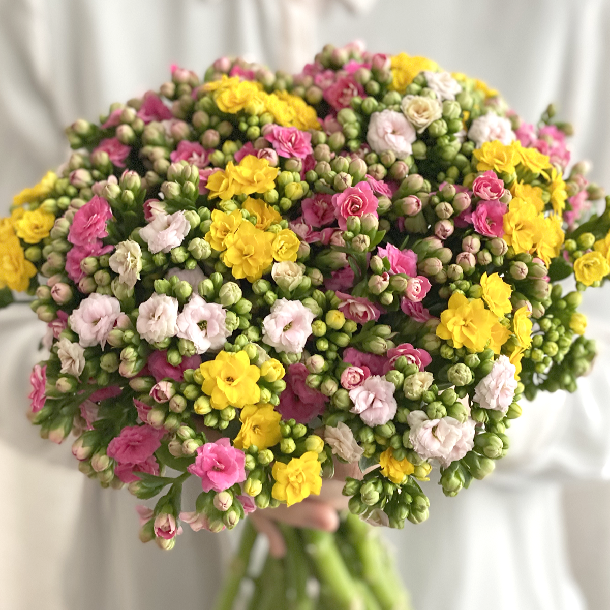 Vores smukke luksusbuket Girly Sunshine består af 12 stilke kalanchoe i farverne gul, pink og rosa. Den er håndbundet, så du kan sætte den direkte i vasen derhjemme. Vi garanterer, at den her vil blomstre smukt i mindst 3 uger. Blomsternes farvenuancer kan variere en smule i forhold til billedet.