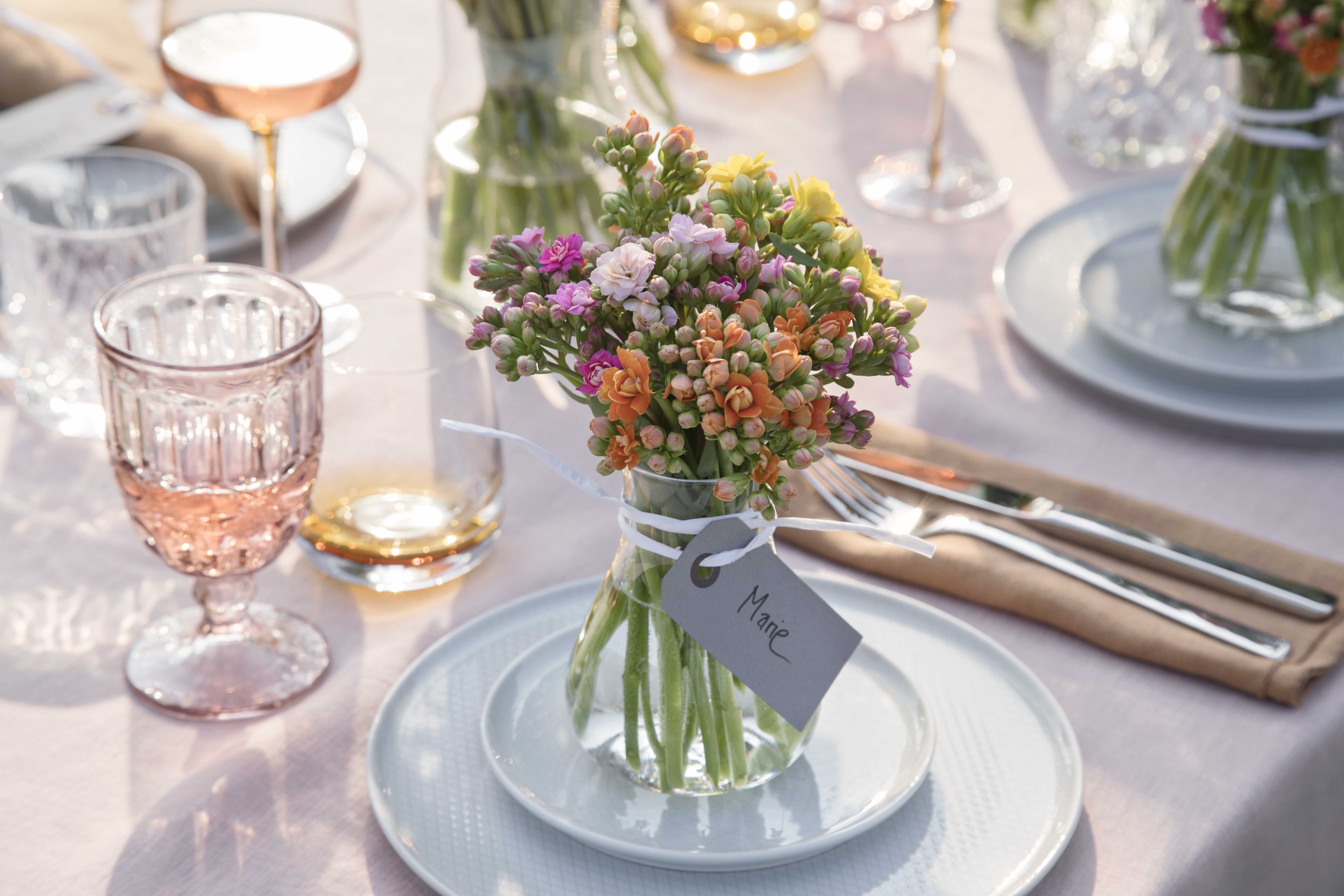With the right tableware, candles and beautiful flowers, you can easily brighten up the table even more. We recommend covering the table with beautiful mini kalanchoes in clear, light vases to create a simple and stylish look. Our potted plants also work perfectly as a table decoration if they are placed down the middle of the table. They are available in an array of beautiful colours that will look great on the party table. If you prefer cut flowers, replace the potted plants with our beautiful stems.