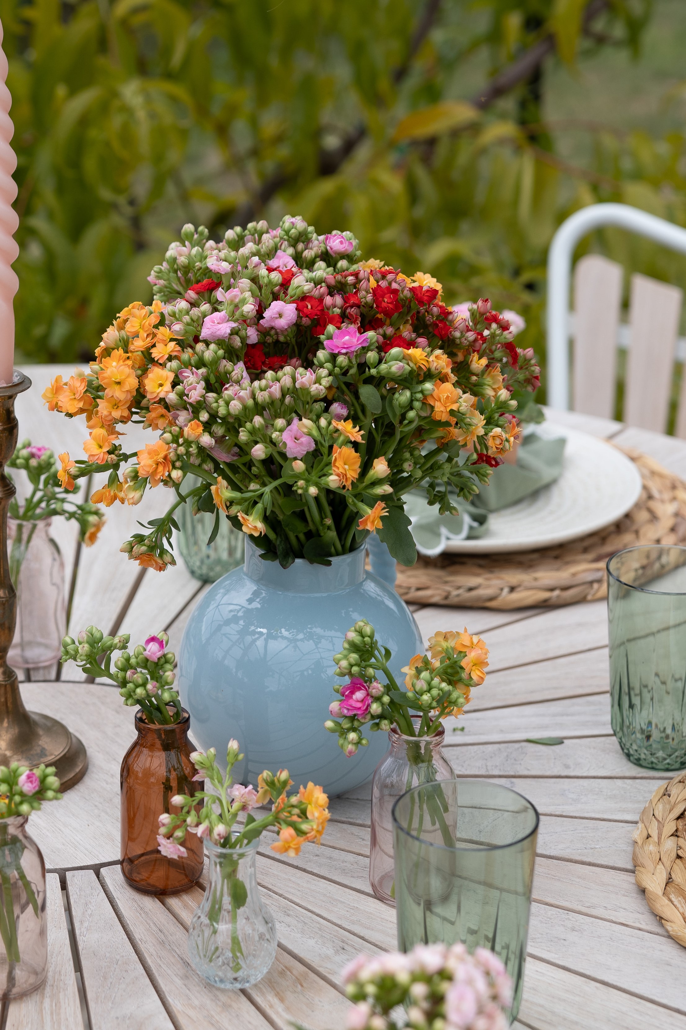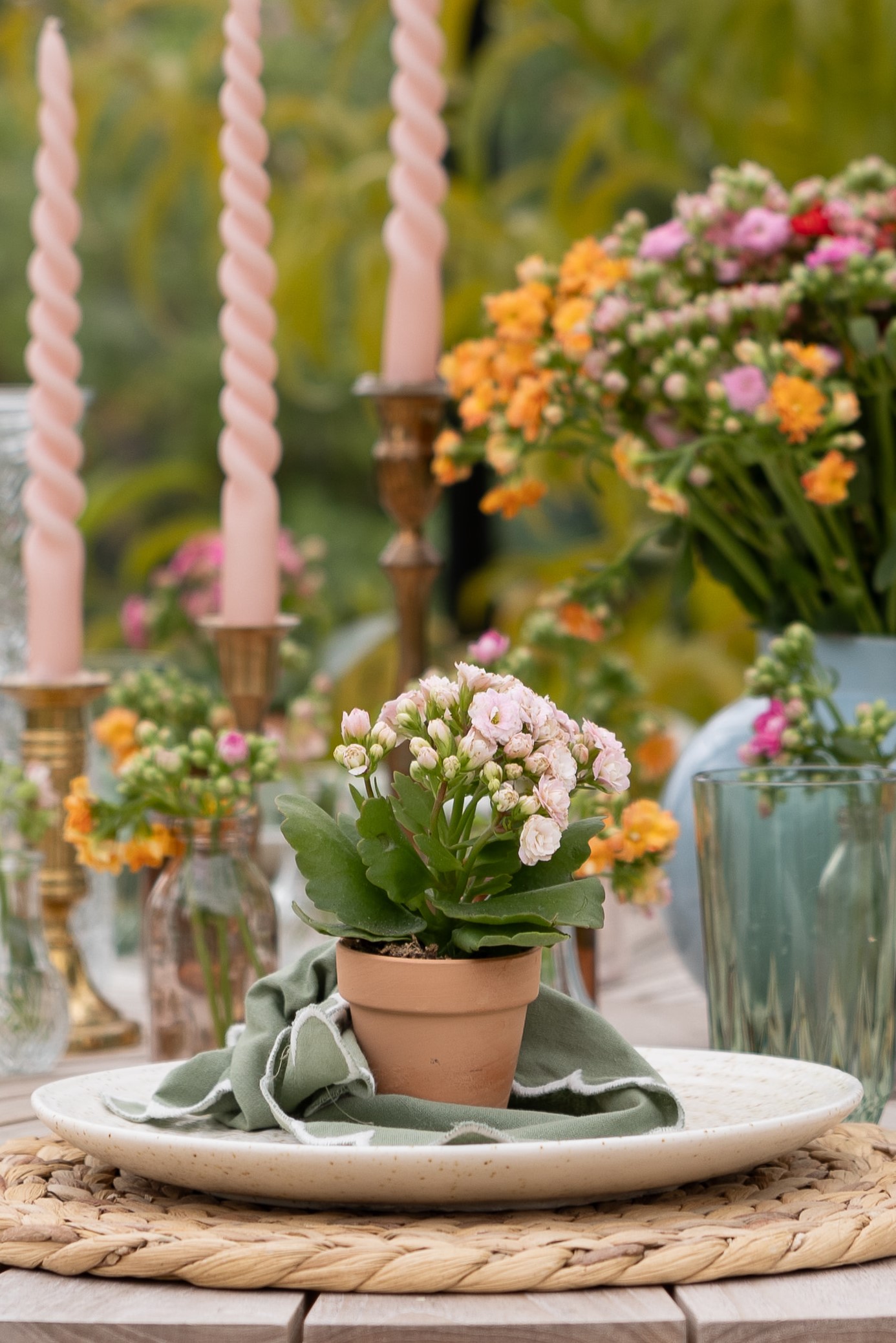 Small, charming potted plants are perfect for making your table setting extra cosy without requiring extensive experience with floral arrangements. Here, we've used small potted plants in different colours and placed a small potted plant on each plate, and the result speaks for itself. If you don't have enough small pots, use napkins or tissue paper and tie the paper around the potted plant with a string, creating your own pot cover for the occasion. In addition to cute potted plants, stems in small vases are also a delightful way to add even more colour and life to the table. Lastly, the large bouquet in beautiful colours enhances the table and harmoniously ties the colours together.