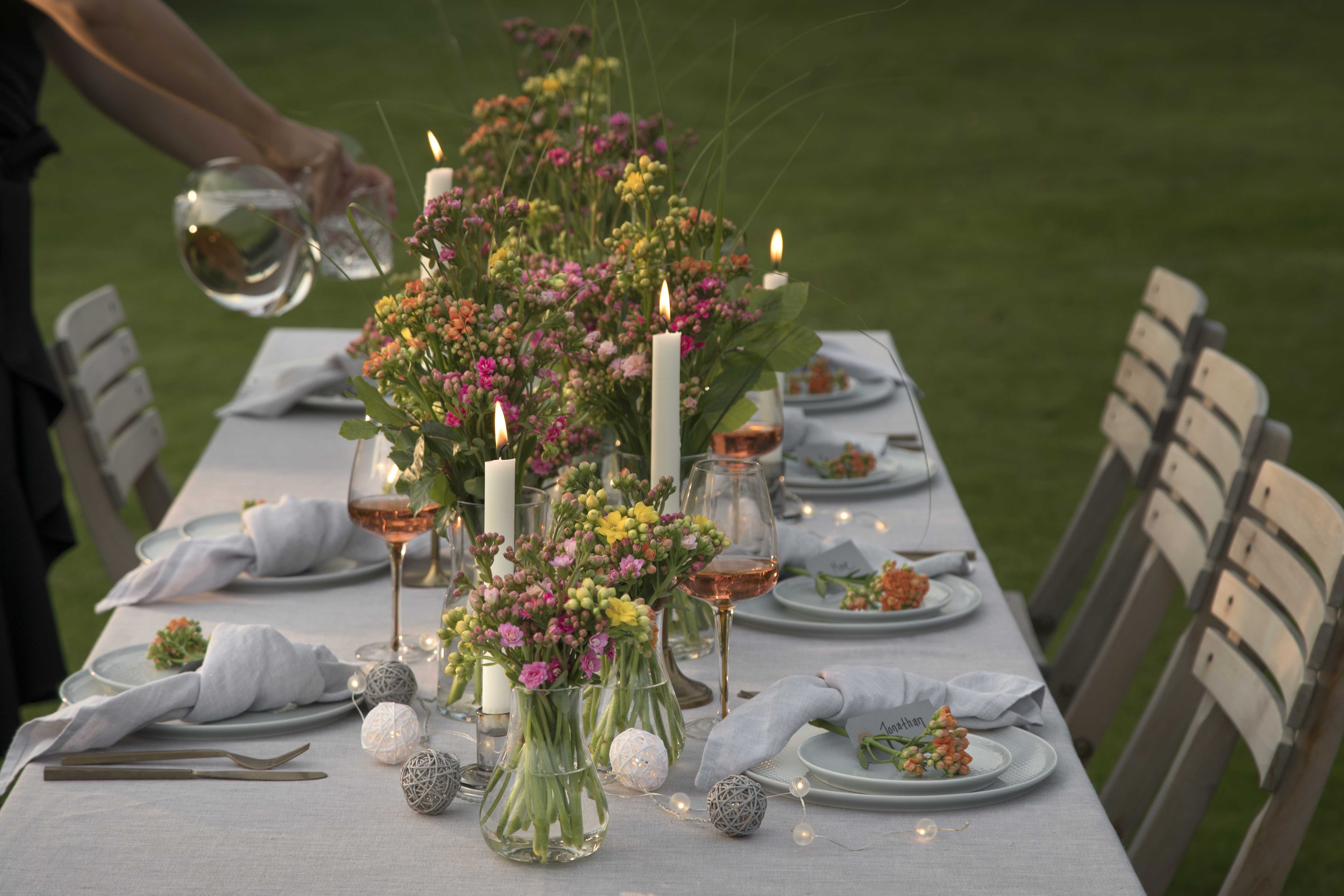 With flowers in summer tones of pink, yellow and orange, you can easily and quickly conjure up a beautiful and natural table setting for this year’s summer party – whether indoors or outdoors.