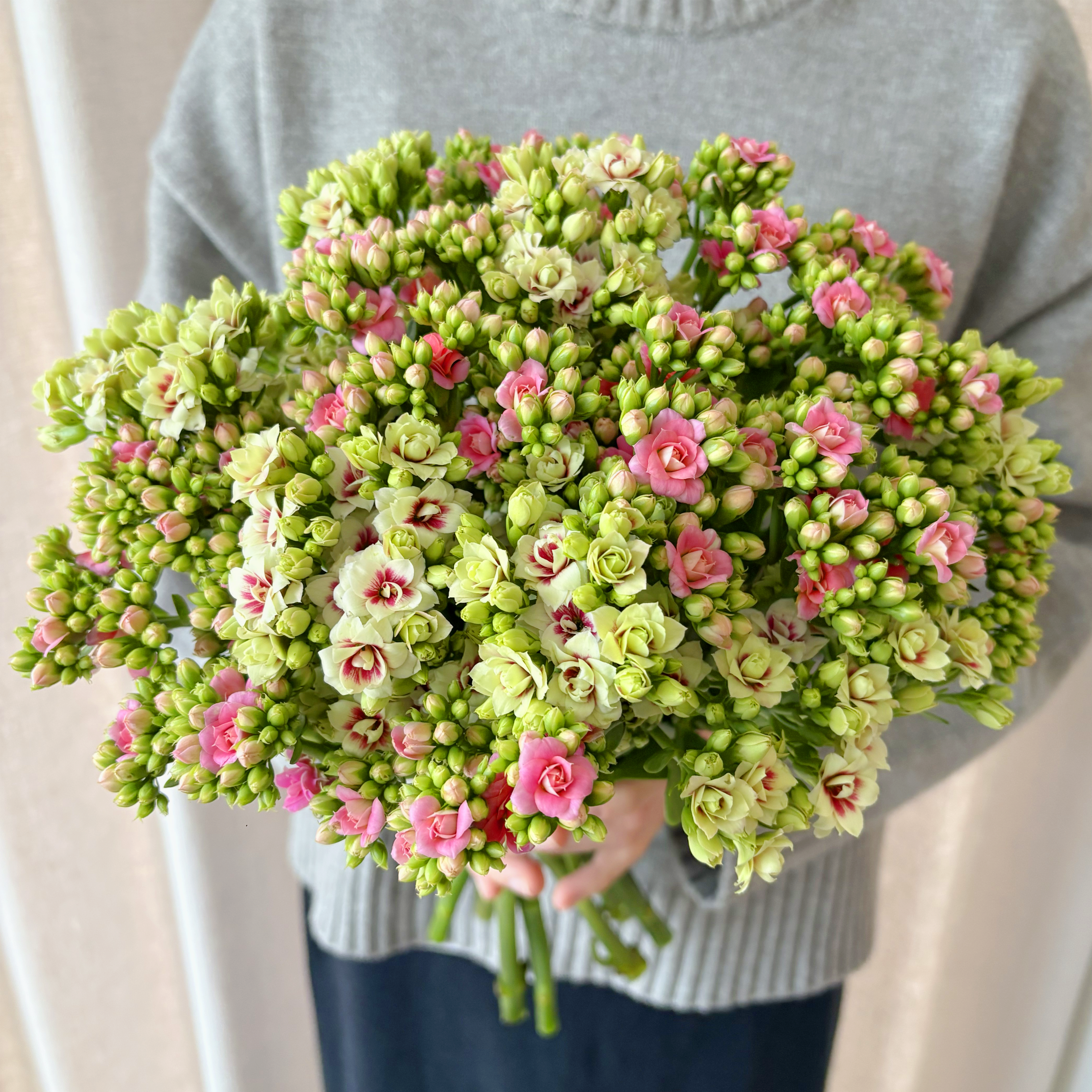 Our beautiful luxury bouquet Blushing Elegance consists of 12 stems of Kalanchoe in the beautiful colour combination white and pink. It is hand-tied so you can put it directly in a vase at home. We guarantee that the bouquet will bloom beautifully for at least 3 weeks. The colour shades of the flowers may vary slightly from the ones shown in the picture.