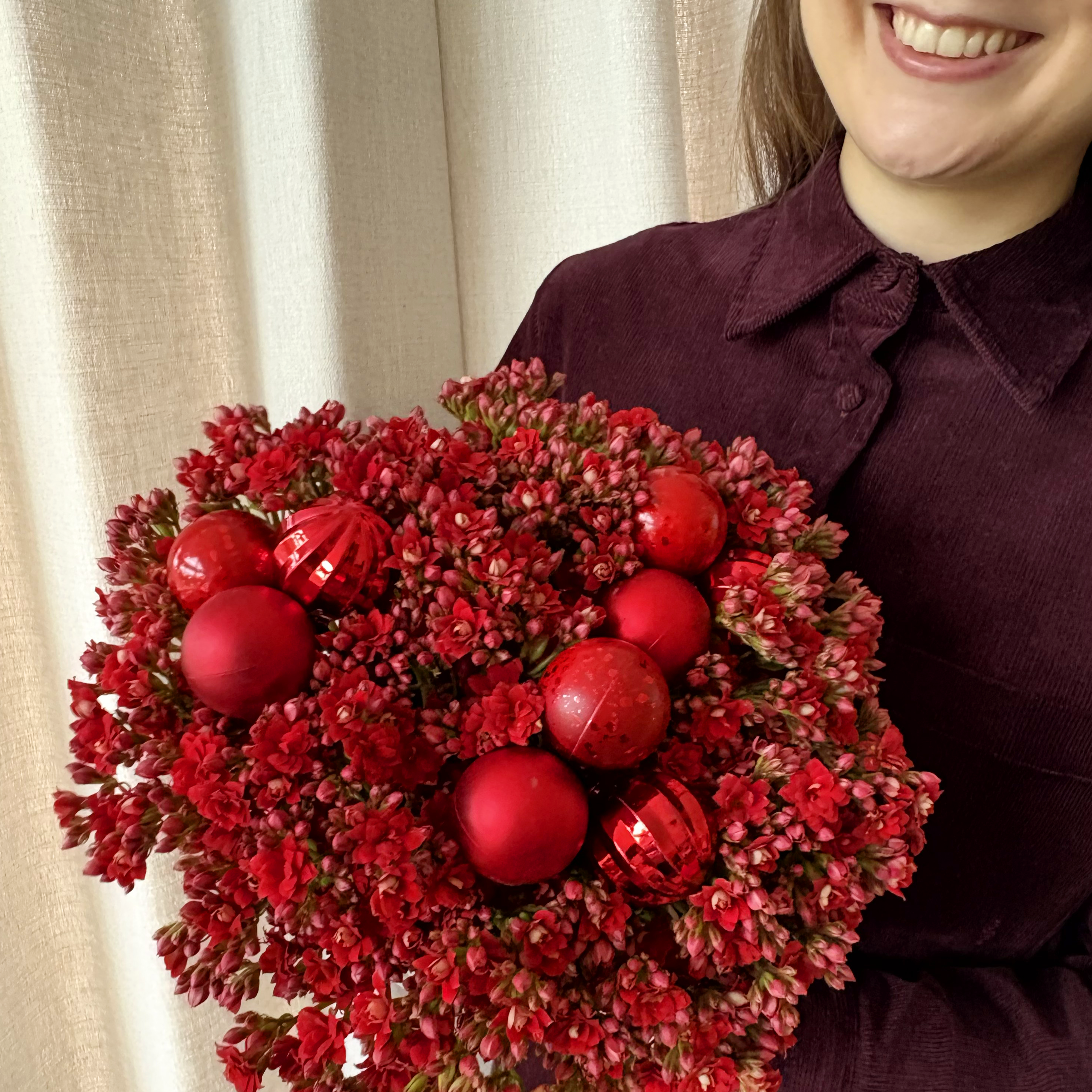 Our beautiful luxury bouquet Wonderful Christmas consists of 12 stems of Kalanchoe in the colour red. It is hand-tied so you can put it directly in a vase at home. We guarantee that the bouquet will bloom beautifully for at least 3 weeks. The colour shades of the flowers may vary slightly from the ones shown in the picture.