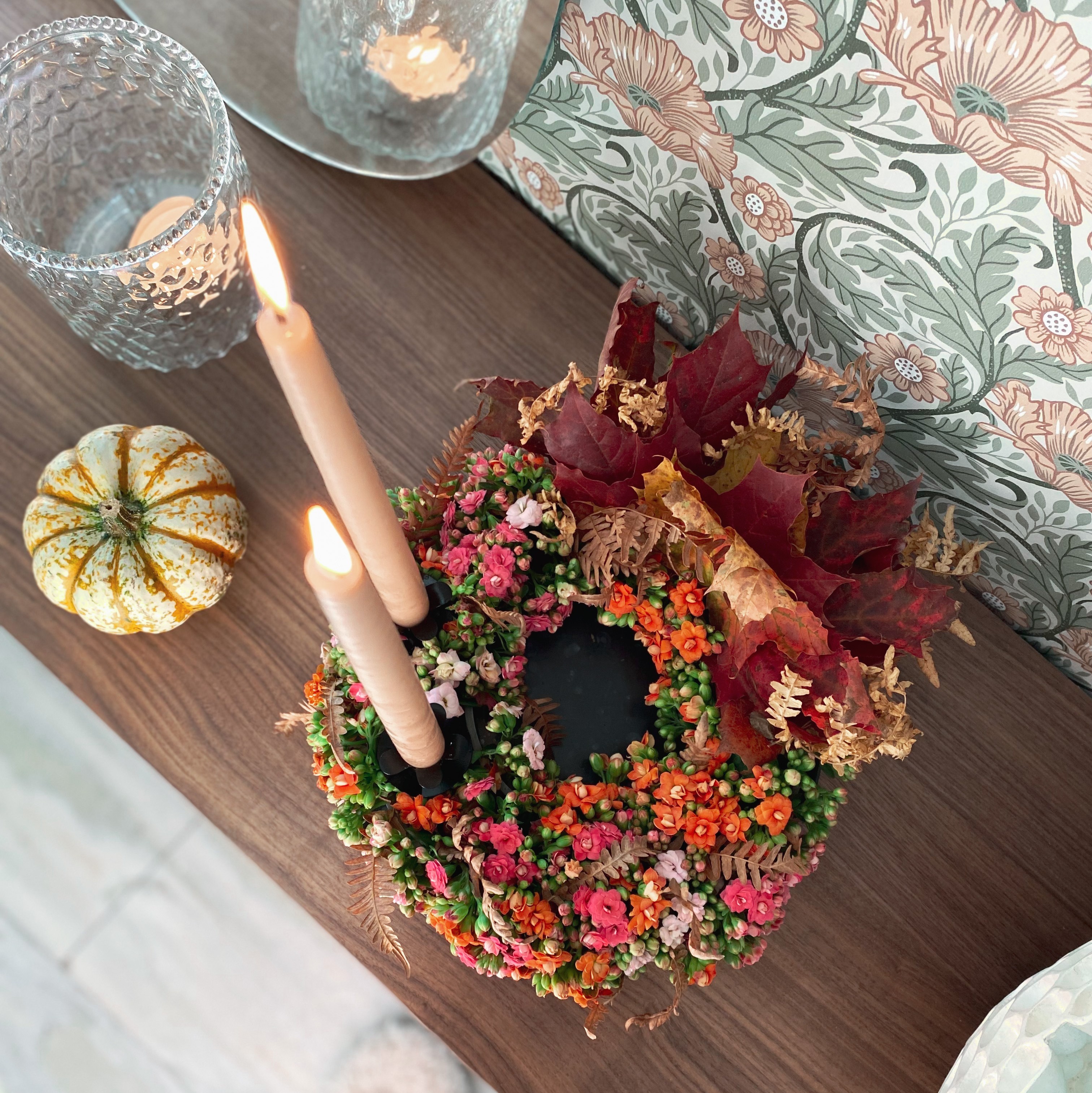 Skab en enkel og farverig efterårskrans med oasis, blomster og blade i sæsonens nuancer – og afslut med et stearinlys for ekstra hygge 🌸🕯️ Perfekt til middage, kaffehygge eller bare for at skabe lidt magi i hverdagen.