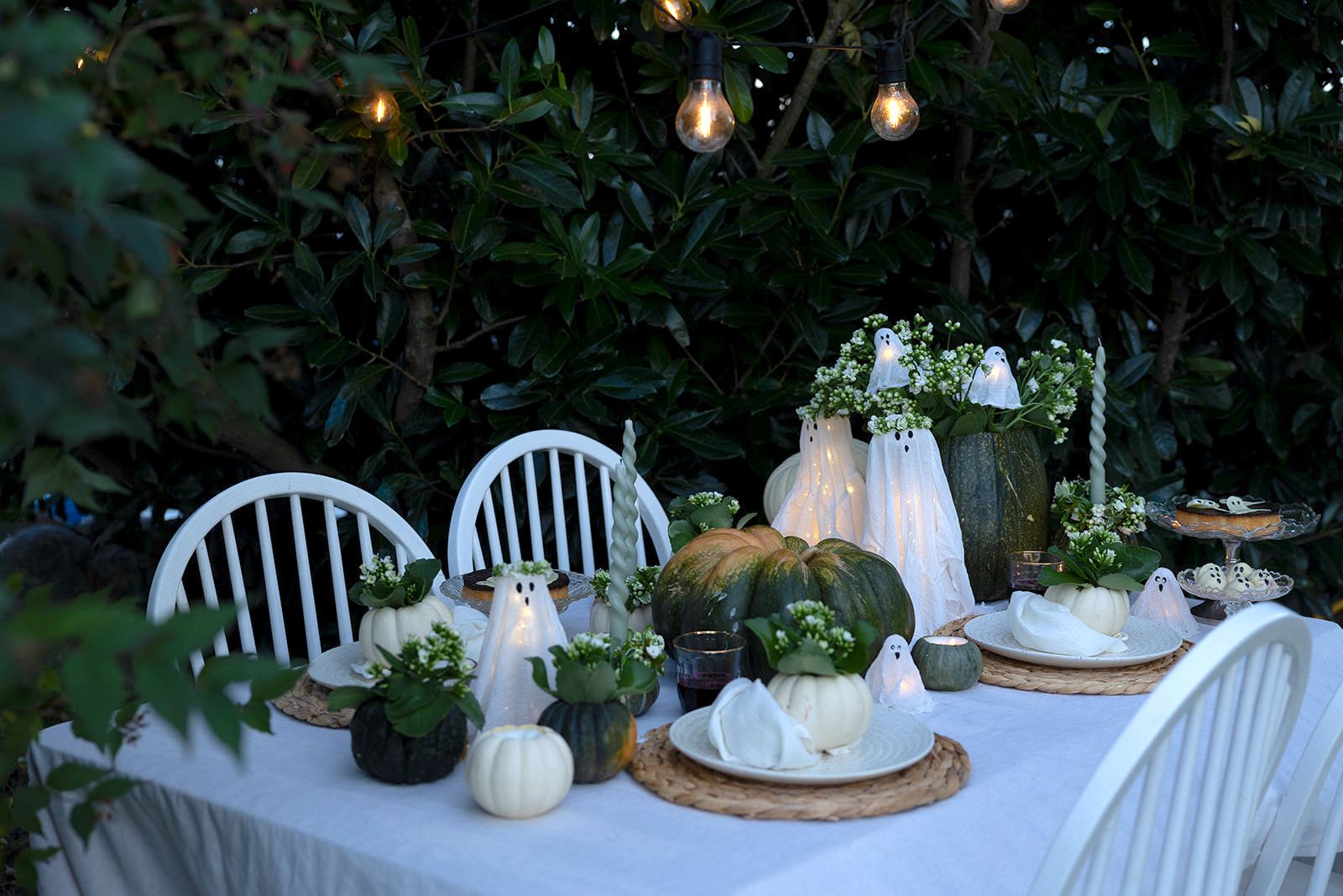 Er du mere i det kreative DIY hjørne til Halloween, så er det oplagt at pynte et smukt bord med hjemmelavede blomsterspøgelser og elegante græskarlys. Begge dekoreret med hvide Queen® Flowers blomsterkranse. Ved at integrere lys i både spøgelser og græskar kan du skabe ekstra stemning og atmosfære, når mørket falder på. De helt perfekte rammer til højtiden. Foruden de lyse, letter og naturskønne farvetoner, kan dekorationerne også laves i en smuk kombination af varme orange og røde farver.