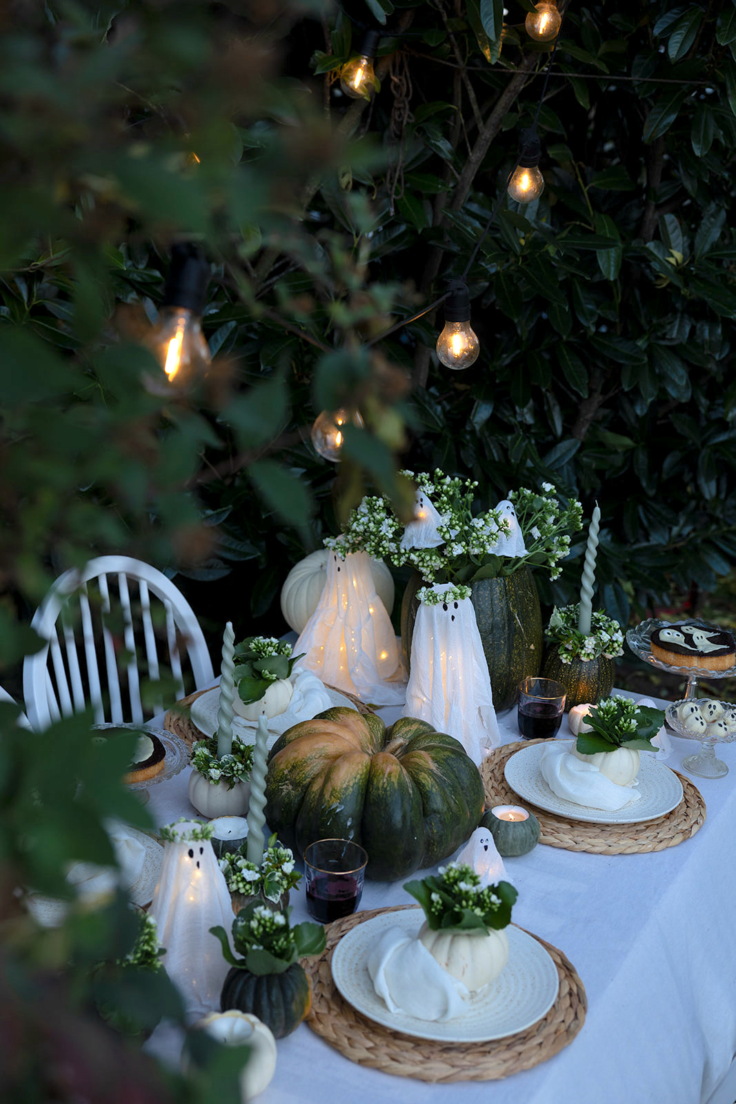 Er du i det kreative DIY hjørne til Halloween, så er det oplagt at pynte et (u)hyggeligt bord med hjemmelavede blomsterspøgelser og elegante græskarlys. Begge dekoreret med hvide Queen® blomster. Ved at sætte lys i både spøgelser og græskar kan du skabe ekstra stemning og atmosfære til når mørket falder på. Perfekt til Halloweenbordet. Foruden de lyse, lette og naturskønne farvetoner, kan dekorationerne også laves i en smuk kombination af varme orange og røde farver.