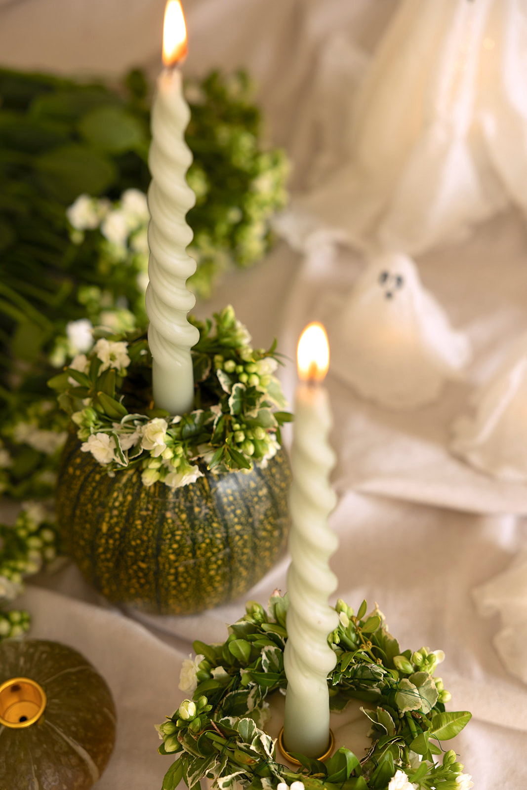Pynt hjemmet med fine græskarlys dekoreret med de smukkeste hvide Queen® Flowers blomsterkranse. Kransene kan også laves mindre, så de for eksempel kan passe til mindre spøgelser eller andre borddekorationer. Smukt pynt til Halloween der kan laves med de mindste, når det ikke må blive alt for uhyggeligt, eller til voksenbordet når højtiden skal fejres med gode venner.