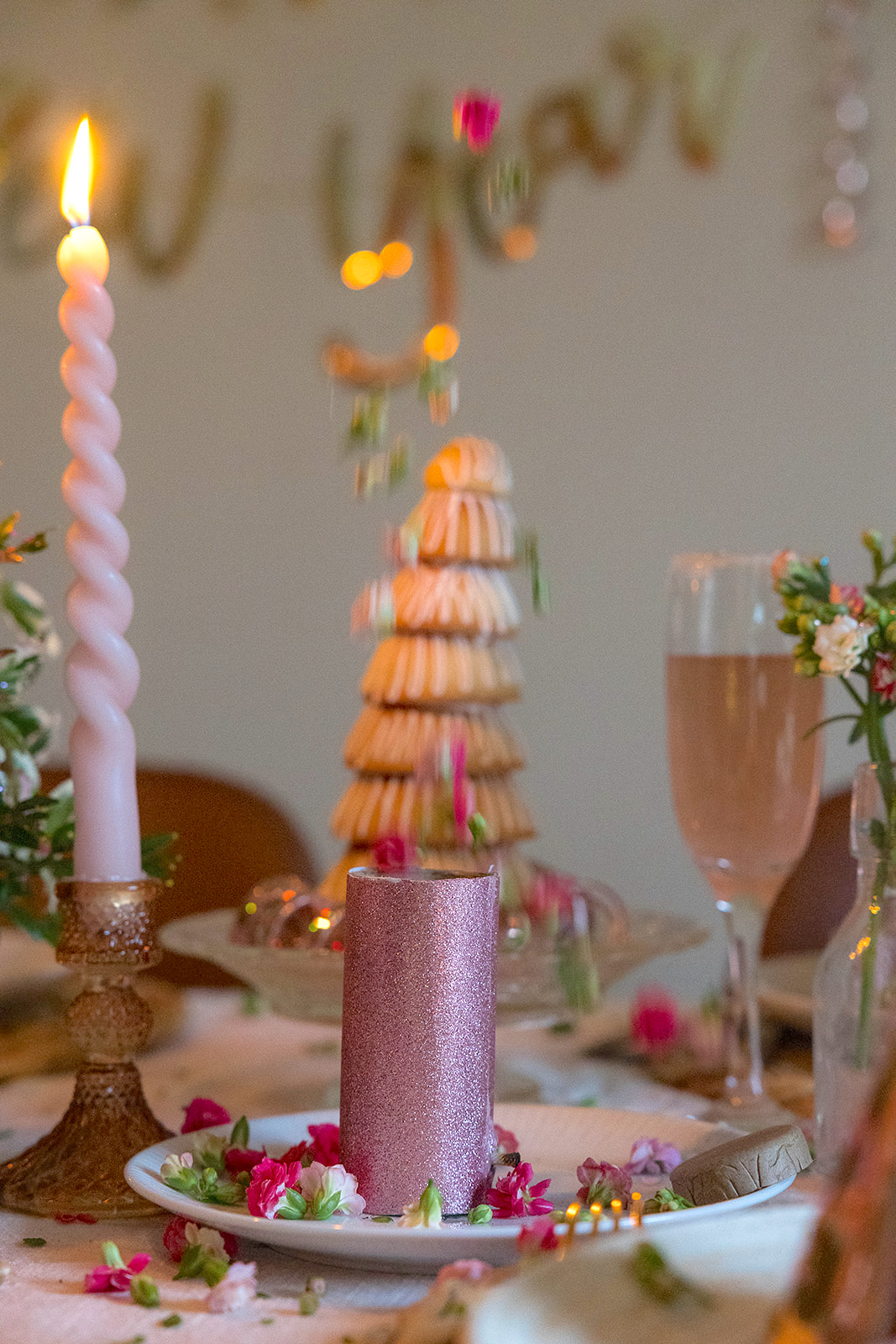 Pynt til selve bordbomben. Her har vi valgt lyserødt glimmerpapir.