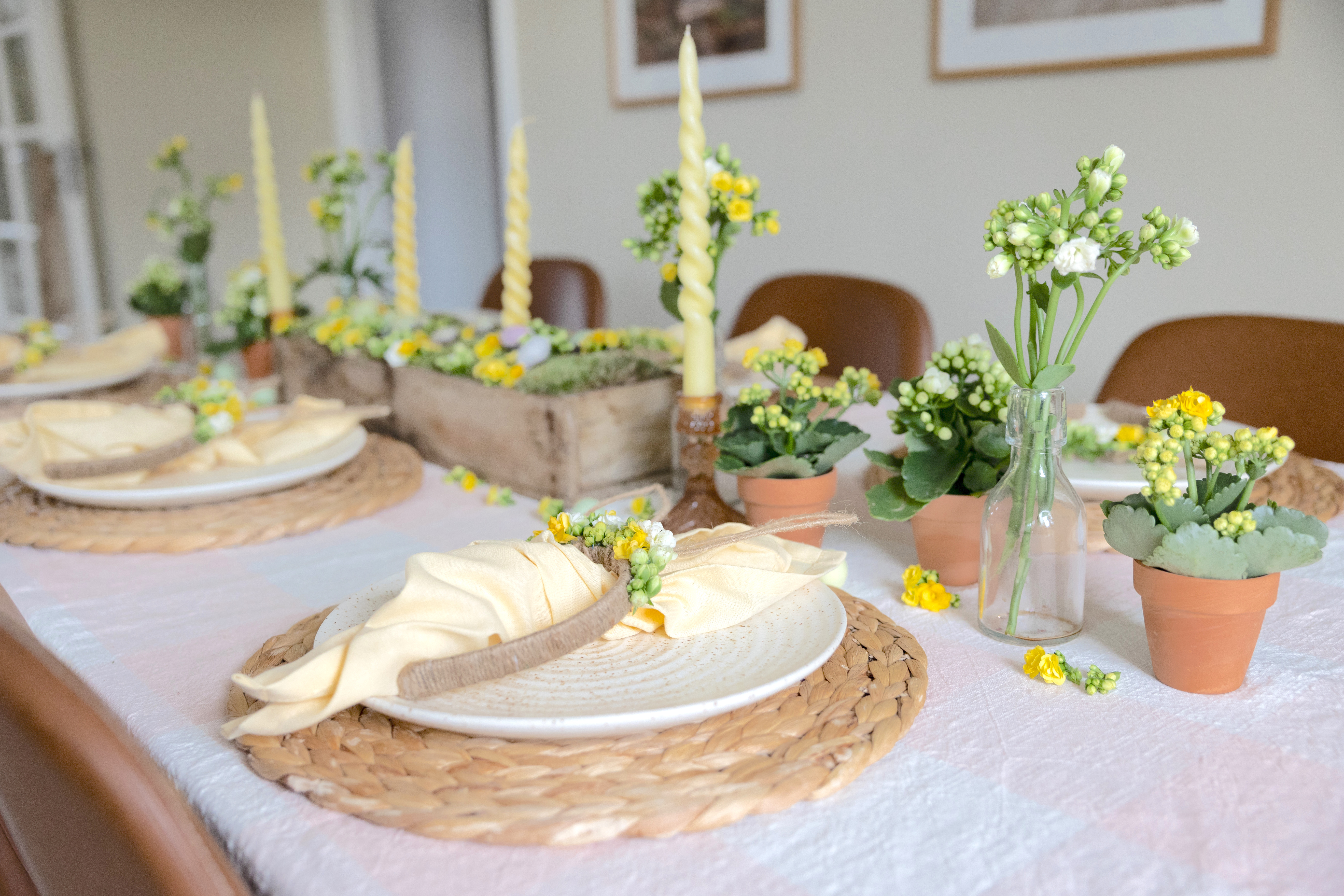 Til et påskebord hører uden tvivl smukke påskeblomster. Dæk et flot og enkelt et af slagsen med vores mini potteplanter i fine skjulere eller en flot påskebuket på bordet. Brug lyse farver, let tekstil og fine krystalglas til at skabe et forårsagtigt udtryk. Ligeledes kan du pynte bordet med påskedekorationer i form af pustede, håndmalede æg eller små blomsterstilke som servietpynt.