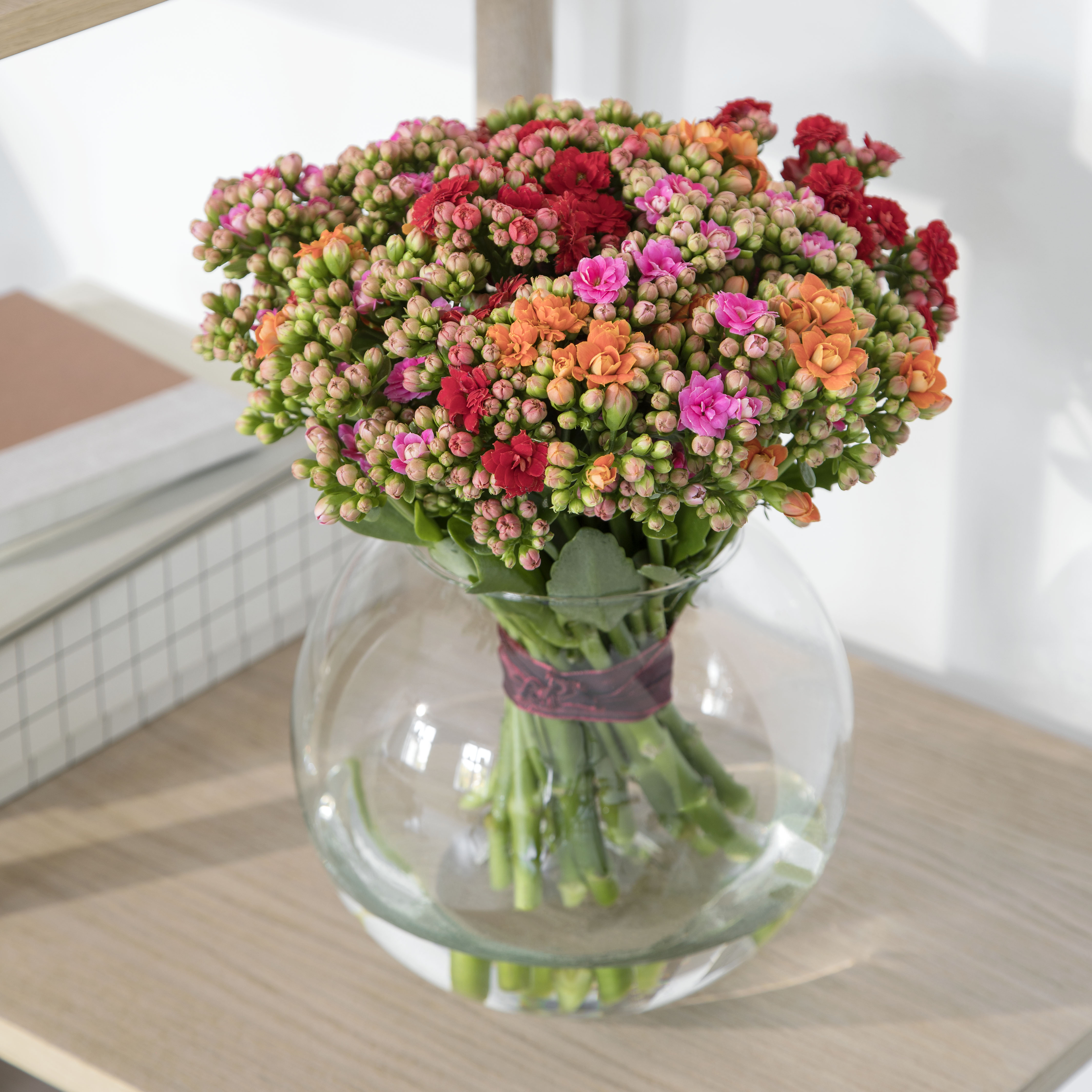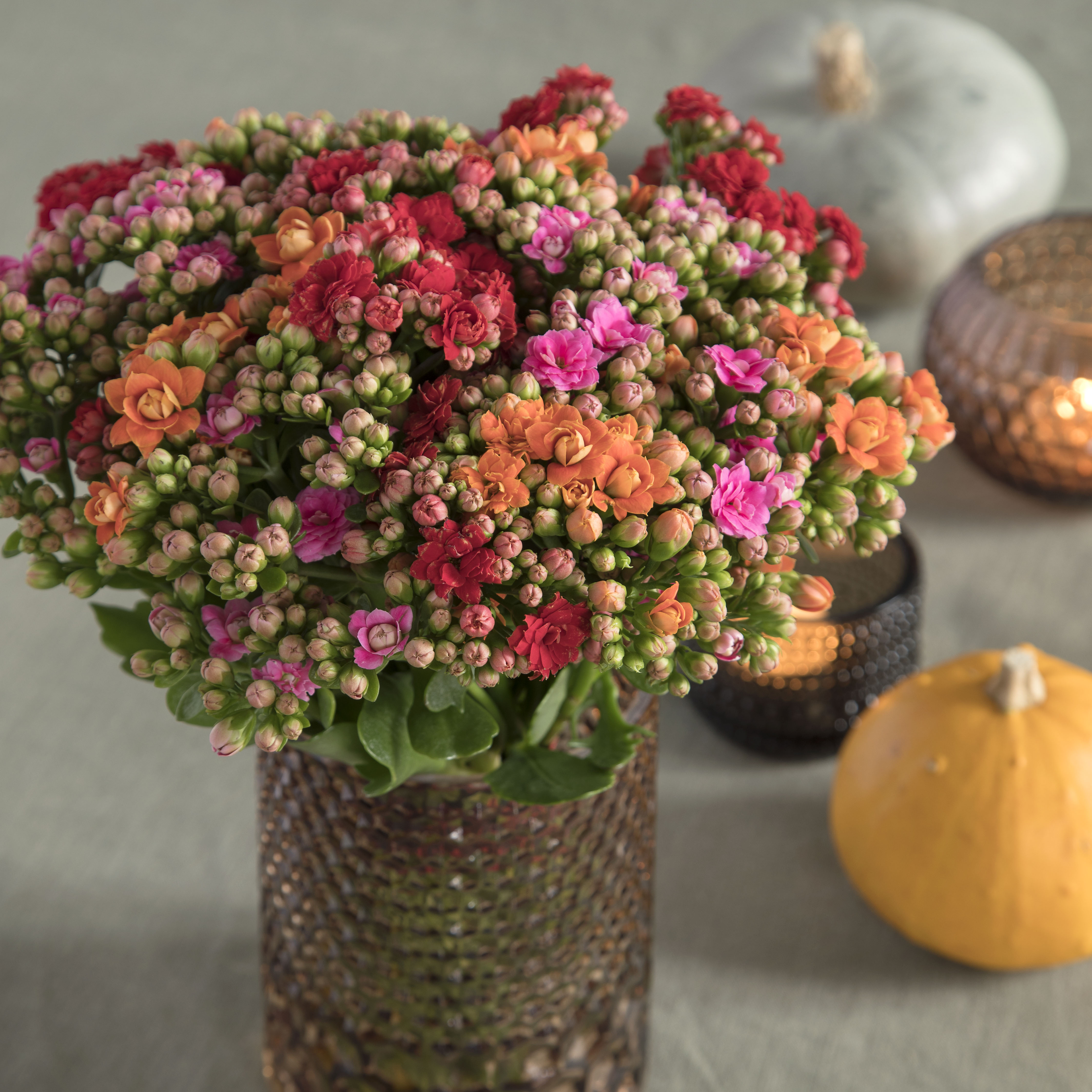 Vores smukke luksusbuket Blazing Autumn består af 12 stilke kalanchoe i farverne orange, rød og pink. Den er håndbundet, så du kan sætte den direkte i vasen derhjemme. Vi garanterer, at den her vil blomstre smukt i mindst 3 uger. Blomsternes farvenuancer kan variere en smule i forhold til billedet.