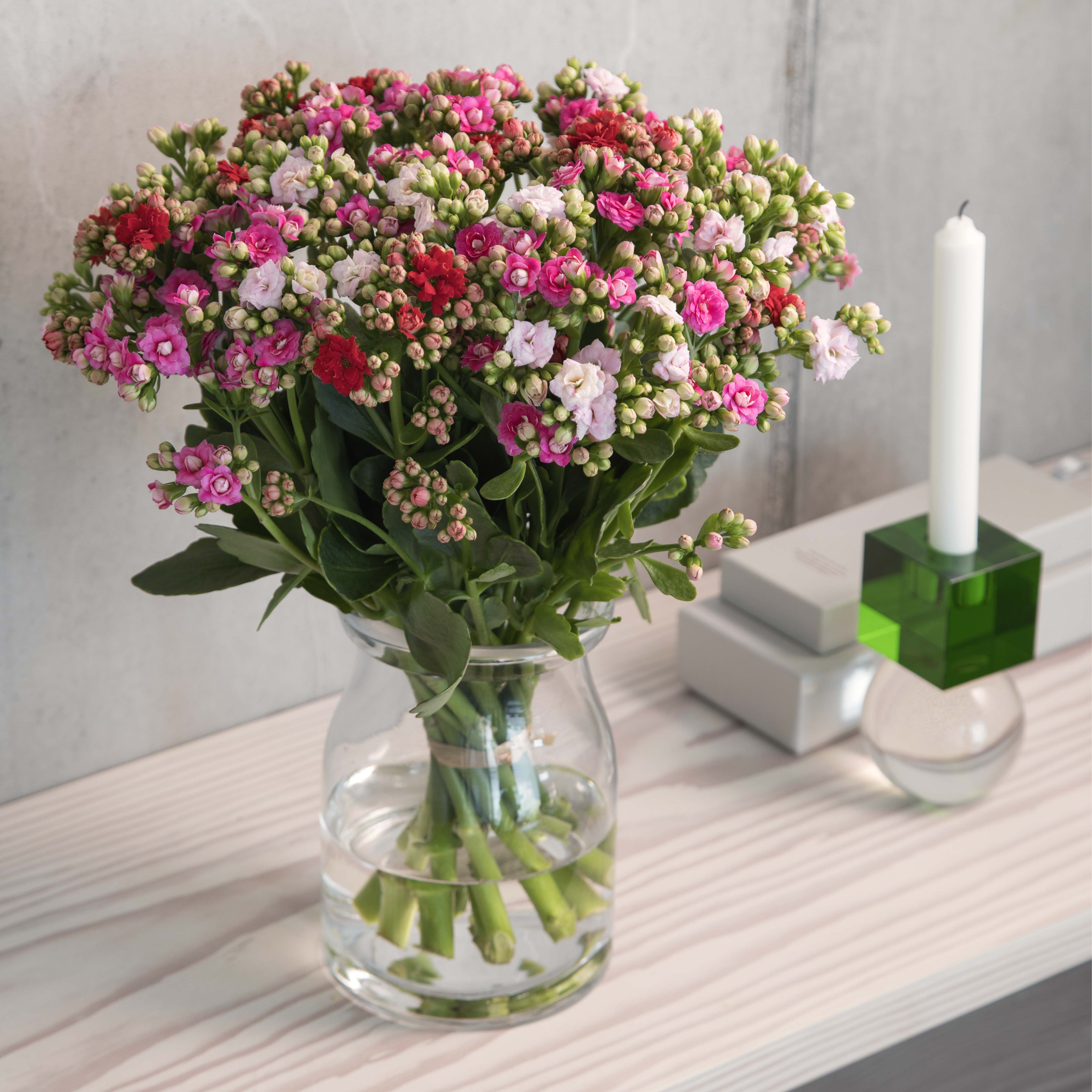 Vores smukke luksusbuket Forever Love består af 12 stilke kalanchoe i farverne rød, pink og rosa. Den er håndbundet, så du kan sætte den direkte i vasen derhjemme. Vi garanterer, at den her vil blomstre smukt i mindst 3 uger. Blomsternes farvenuancer kan variere en smule i forhold til billedet.