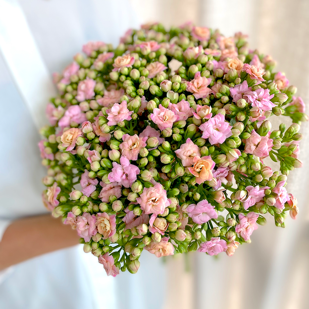 Vores smukke luksusbuket Rosy Delight består af 12 stilke kalanchoe i farven rosa. Den er håndbundet, så du kan sætte den direkte i vasen derhjemme. Vi garanterer, at den her vil blomstre smukt i mindst 3 uger. Blomsternes farvenuancer kan variere en smule i forhold til billedet.