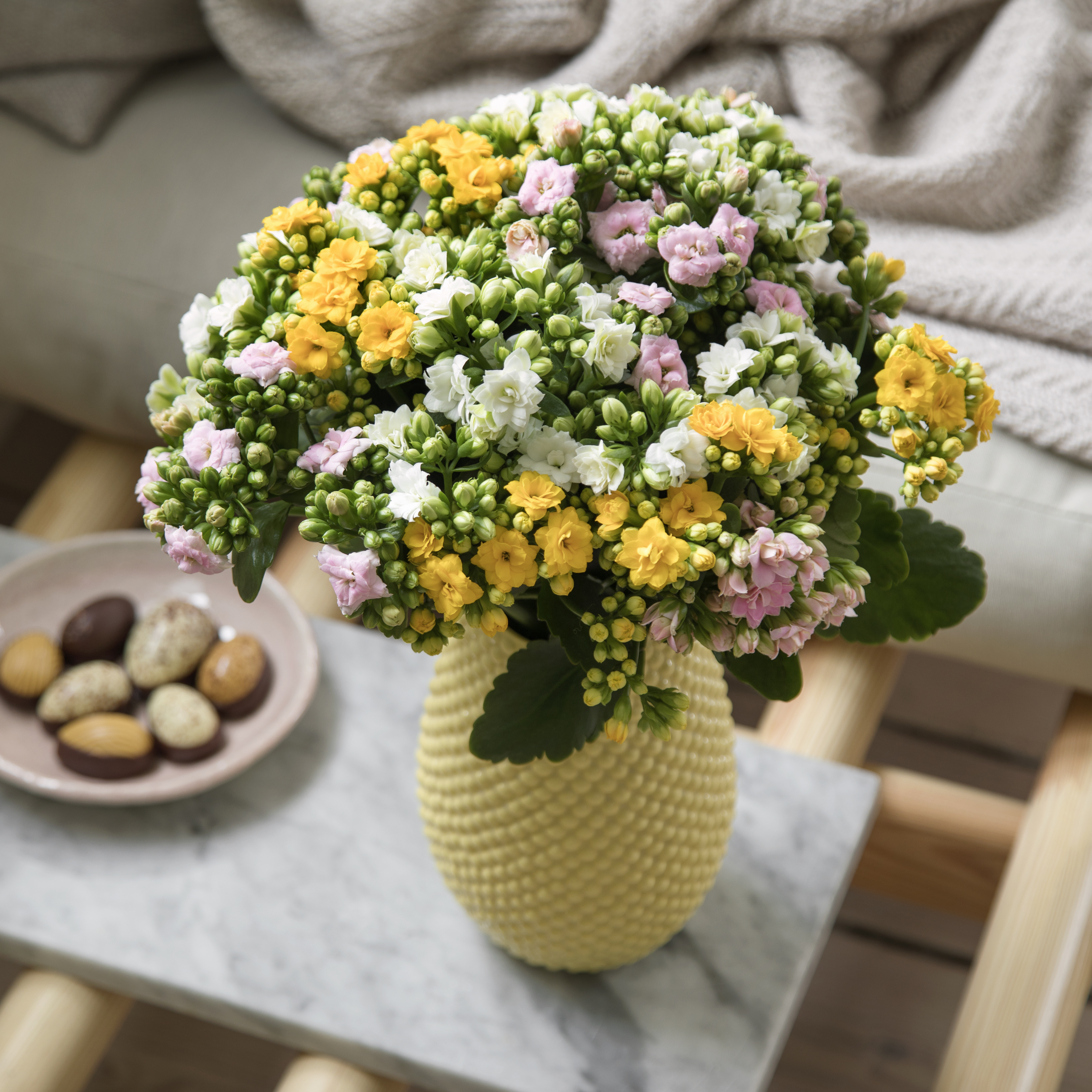 Lad foråret flytte ind med vores smukke Spring Melody buket – en luksuriøs og langtidsholdbar blomsterbuket. Buketten består af 12 stilke kalanchoe i elegante nuancer af hvid, gul og rosa, der tilsammen skaber et friskt og harmonisk udtryk. Hver buket er håndbundet, så den er klar til at blive sat direkte i din yndlingsvase derhjemme.