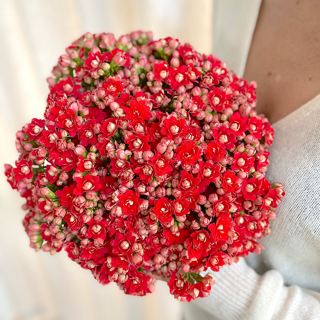 Vores smukke luksusbuket Velvet Red består af 12 stilke kalanchoe i farven rød. Den er håndbundet, så du kan sætte den direkte i vasen derhjemme. Vi garanterer, at den her vil blomstre smukt i mindst 3 uger. Blomsternes farvenuancer kan variere en smule i forhold til billedet.