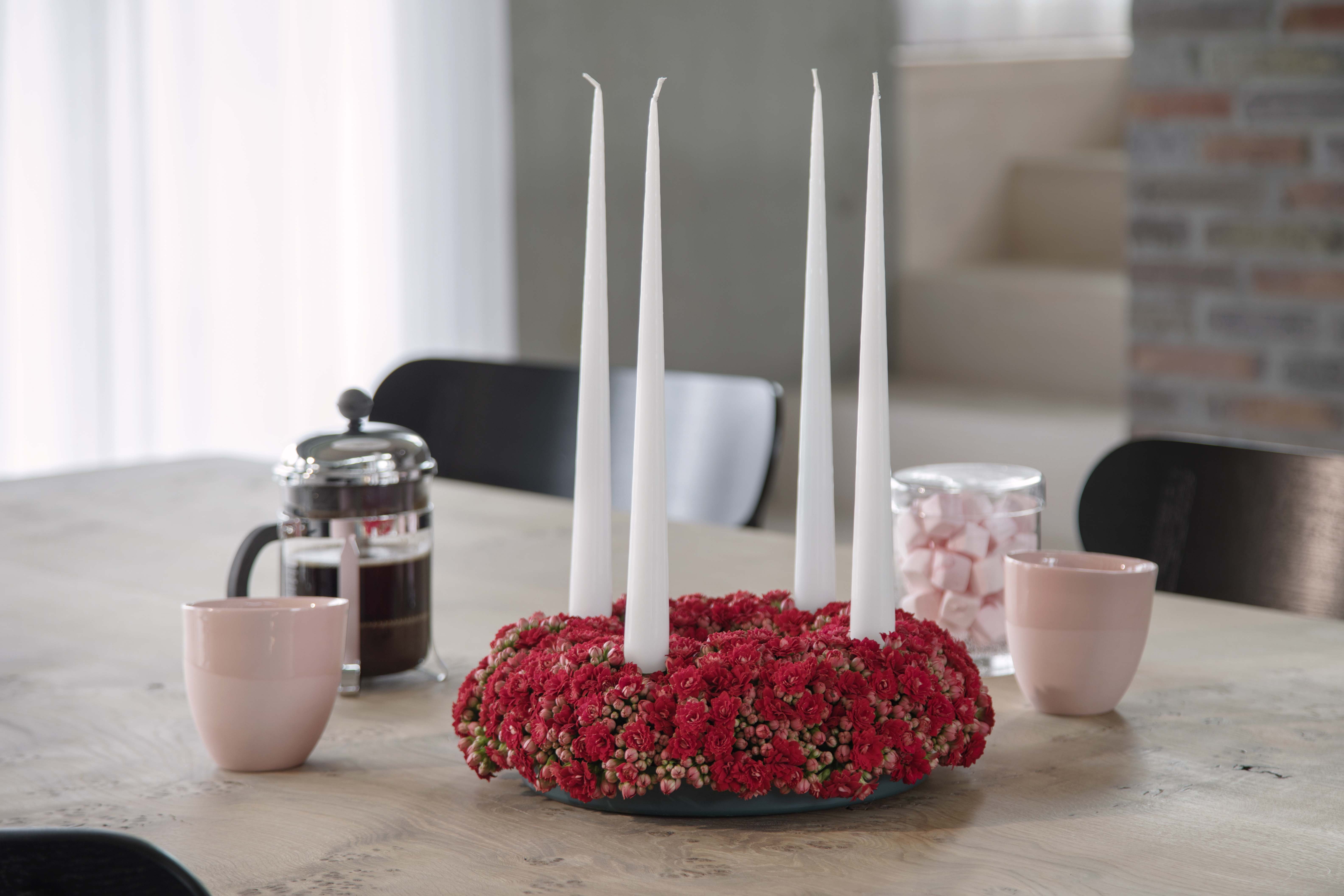 Another cosy DIY project could be this beautiful calendar candle decoration. It is simple to make but looks incredibly beautiful and elegant. It is the perfect Christmas activity for the whole family. The flowers are easy to place in the oasis, and there are plenty of opportunities to unleash your creativity. You can use flowers from our bouquets, bundles, or potted plants to achieve the colour scheme that suits you and your home.