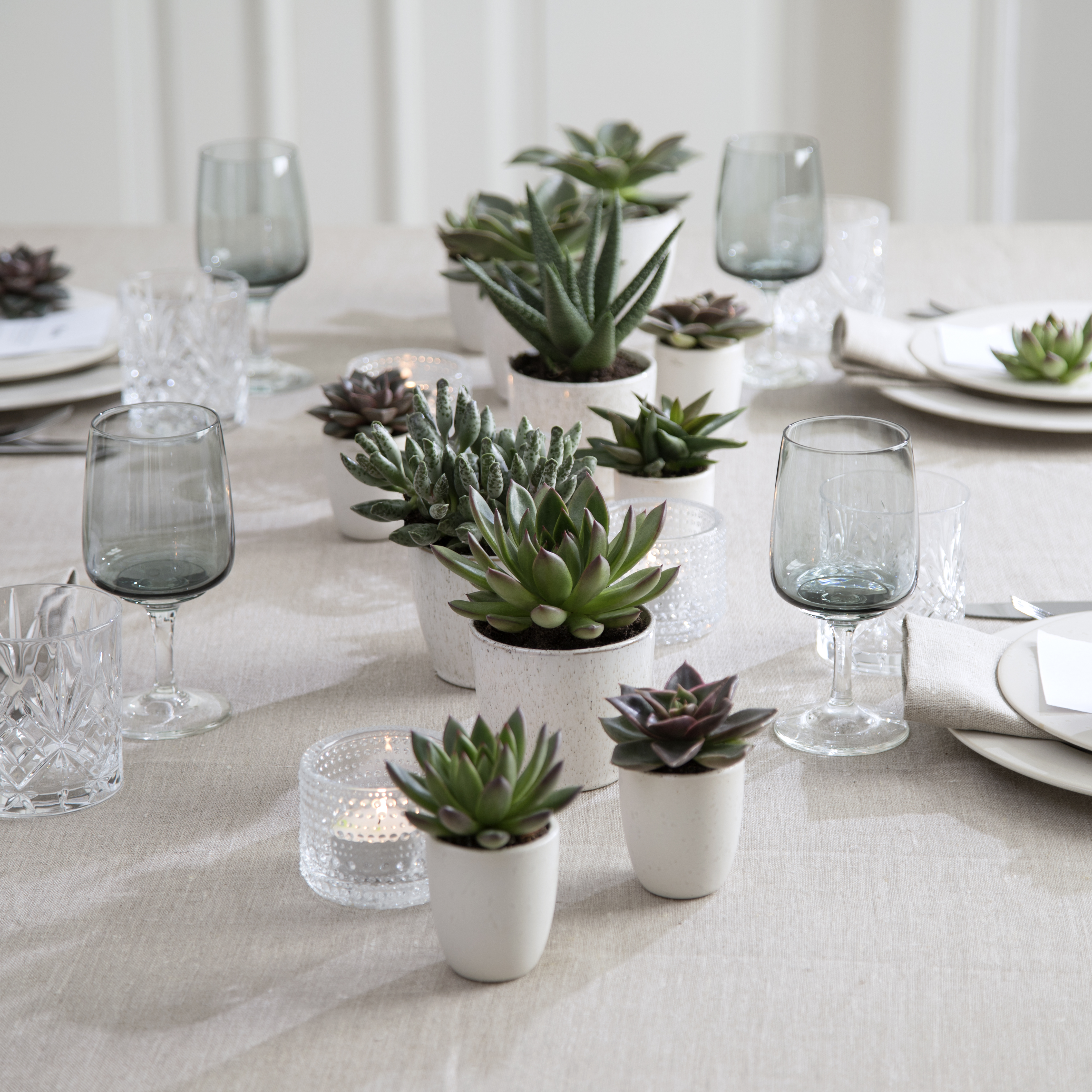 With succulents as table decor, you achieve a beautiful green look that is perfect when the table setting should be more subdued yet full of finesse and colour.