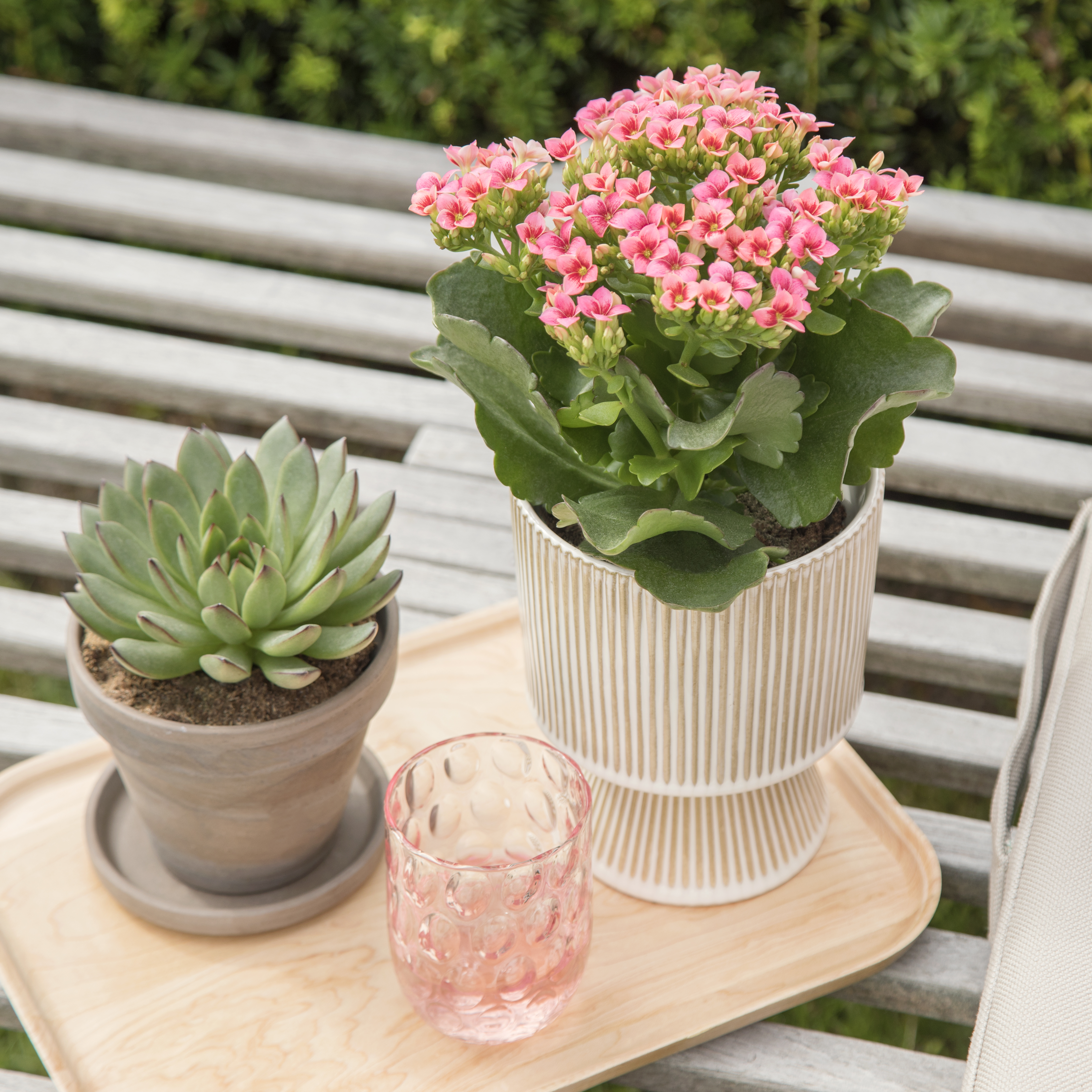 Outdoor plants don't have to be only lush beds and large flower pots. They can also be small, delicate potted plants and succulents! They create a different expression that spreads life and joy to your outdoor space throughout the summer. In the picture, one of our many beautiful potted plants has been used, combined with a sculptural succulent. Both plants can tolerate shade and sun, come in many different varieties, and require minimal care. The combination of large pots with Queen® Outdoor and smaller potted plants can create a colourful interplay. Let your imagination run wild and delight everyone around you with cosy surroundings.