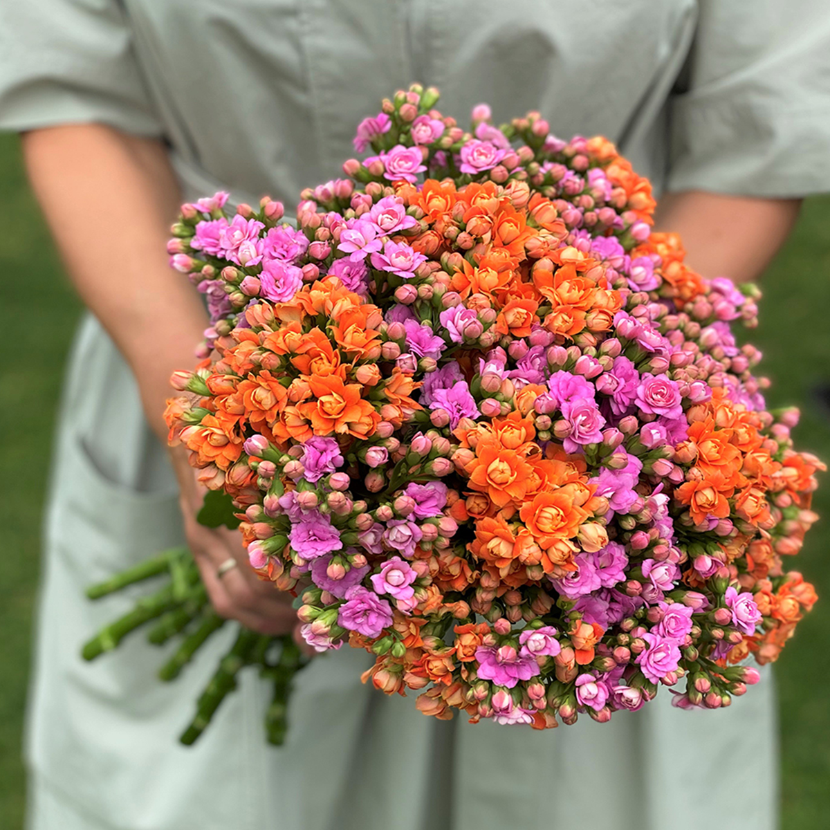 Our beautiful luxury bouquet Brilliant Taffy consists of 12 stems of Kalanchoe in the colours orange and pink. It is hand-tied so you can put it directly in a vase at home. We guarantee that the bouquet will bloom beautifully for at least 3 weeks. The colour shades of the flowers may vary slightly from the ones shown in the picture.