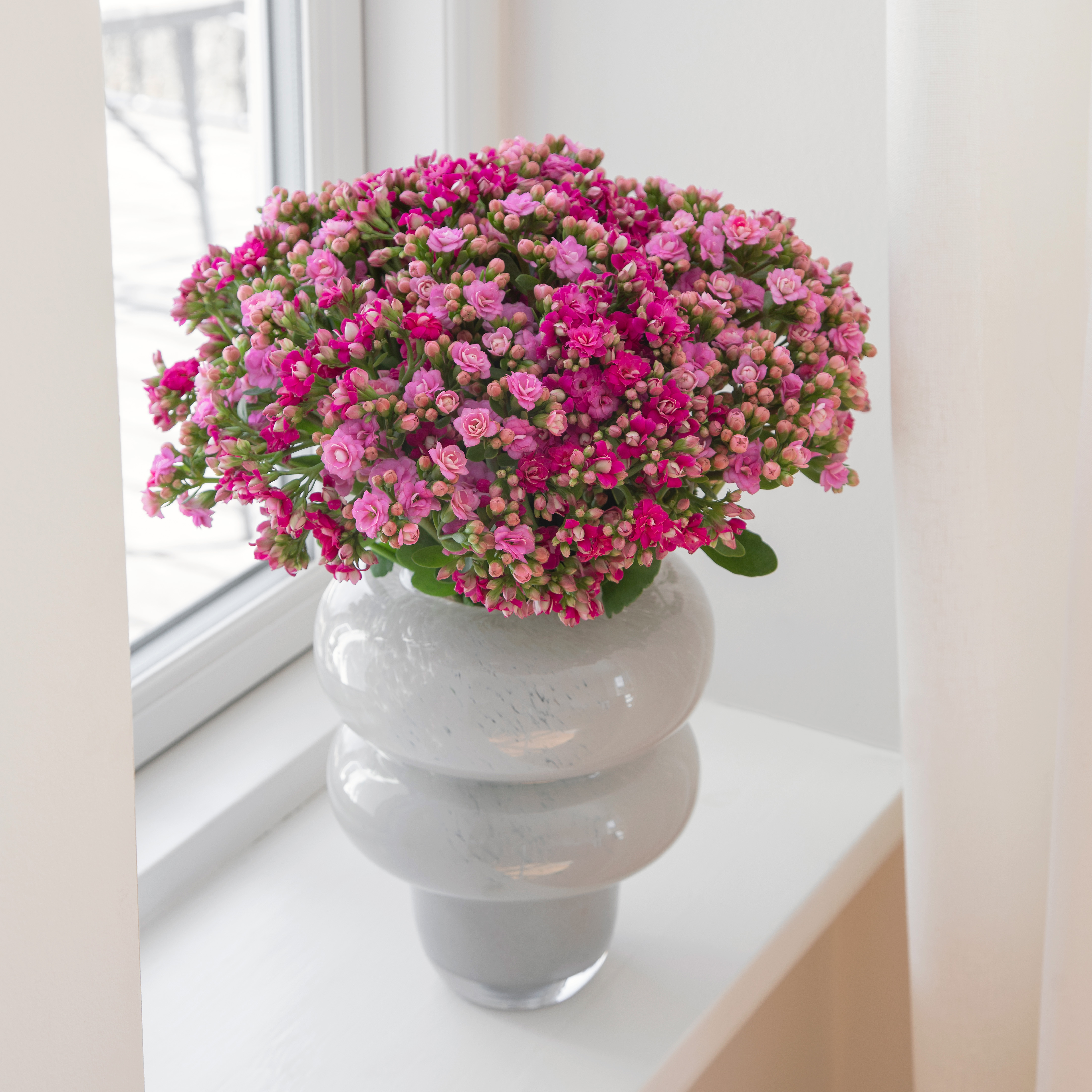 Our beautiful luxury bouquet Elegant Taffy consists of 12 stems of Kalanchoe in the colours light pink and purple/dark pink. It is hand-tied so you can put it directly in a vase at home. We guarantee that the bouquet will bloom beautifully for at least 3 weeks. The colour shades of the flowers may vary slightly from the ones shown in the picture.