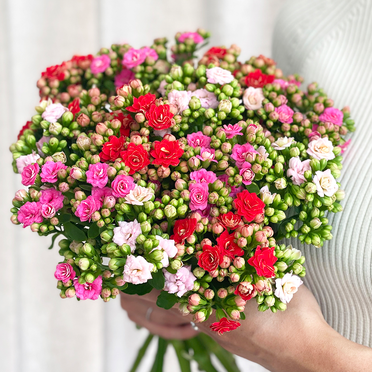 Our beautiful luxury bouquet Forever Love consists of 12 stems of Kalanchoe in the colours red, dark pink and light pink. It is hand-tied so you can put it directly in a vase at home. We guarantee that the bouquet will bloom beautifully for at least 3 weeks. The colour shades of the flowers may vary slightly from the ones shown in the picture.
