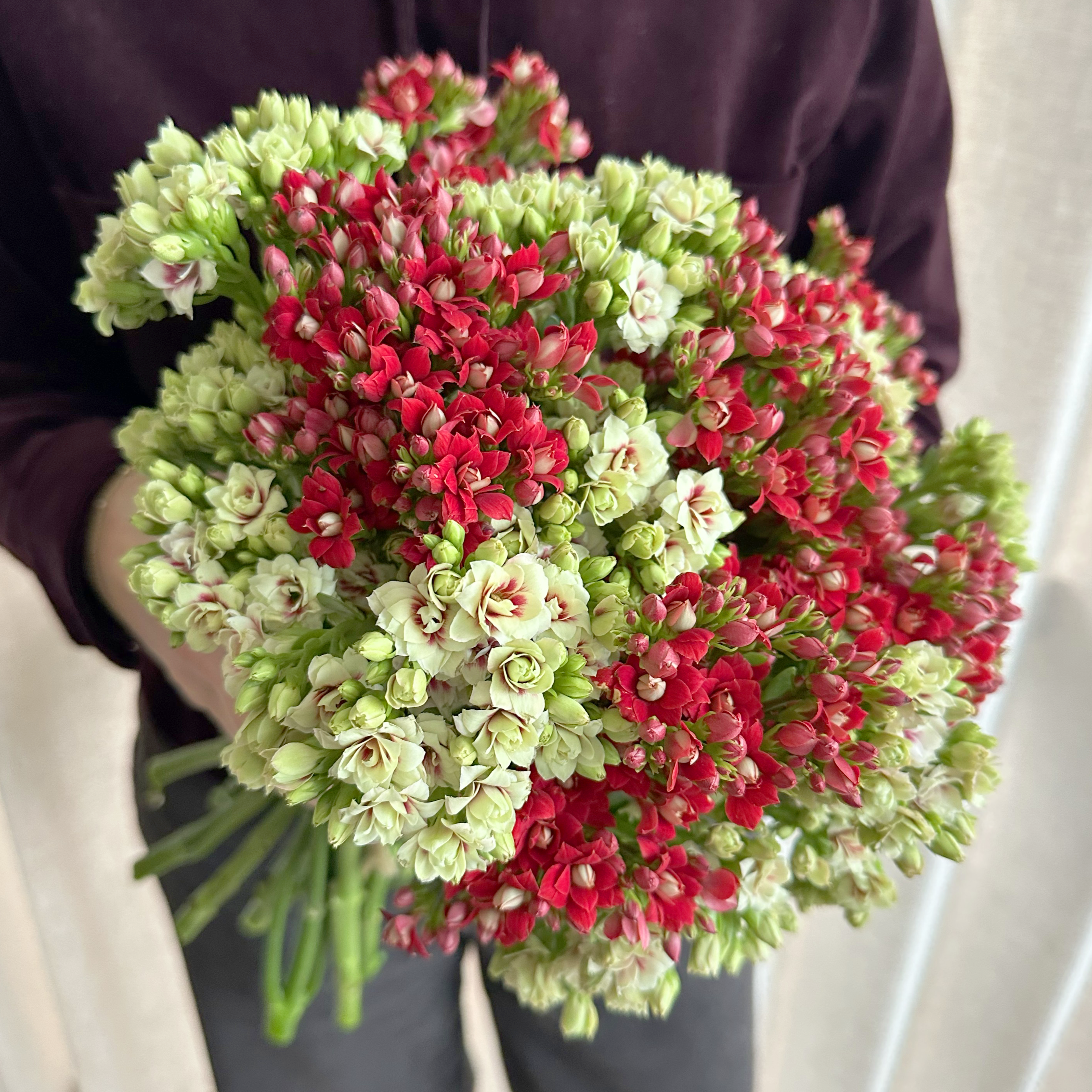 Our beautiful luxury bouquet Snowberry Bliss consists of 12 stems of Kalanchoe in the colours swirly white and red. It is hand-tied so you can put it directly in a vase at home. We guarantee that the bouquet will bloom beautifully for at least 3 weeks. The colour shades of the flowers may vary slightly from the ones shown in the picture.