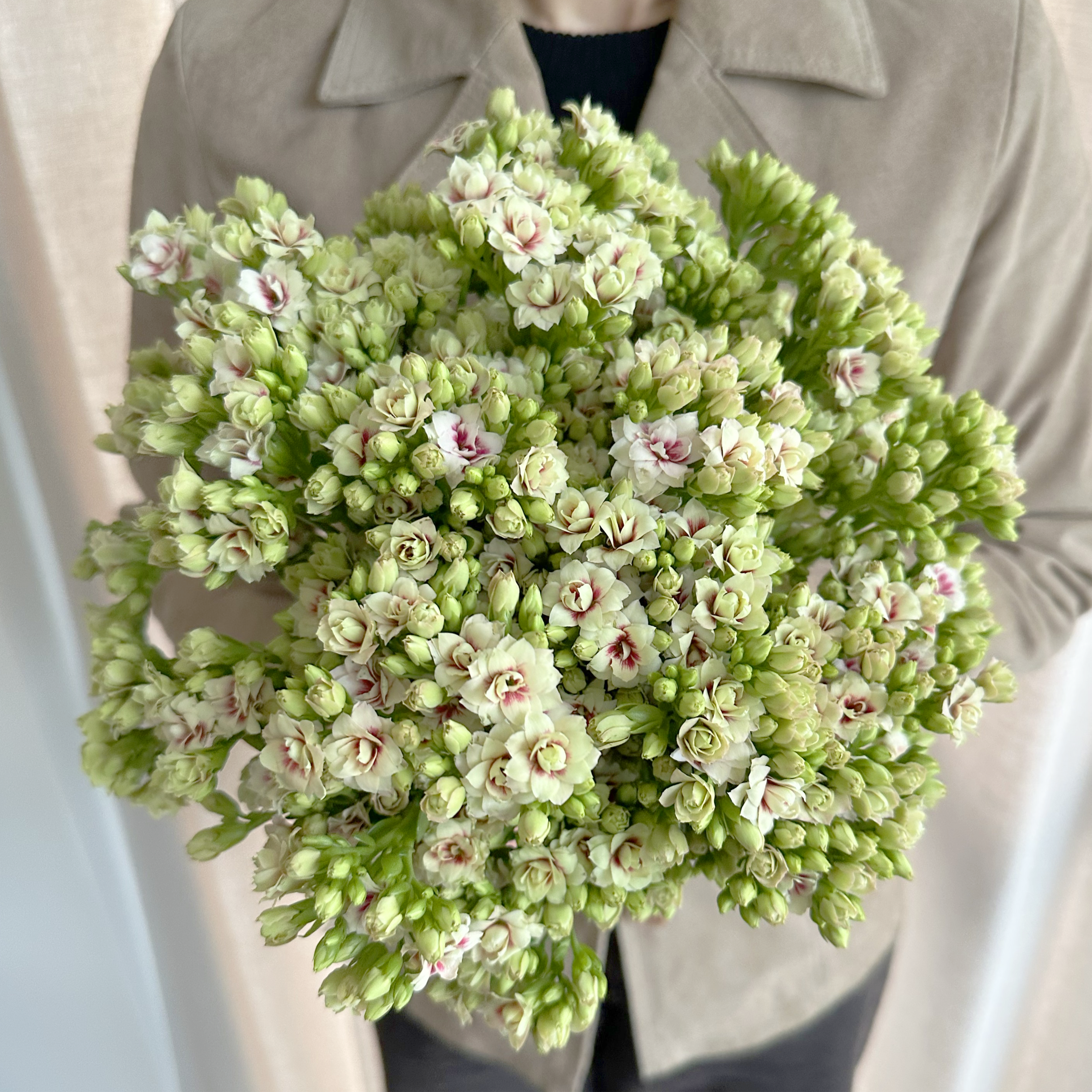 Our beautiful luxury bouquet Swirly Dream consists of 12 stems of Kalanchoe in the beautiful colour white. It is hand-tied so you can put it directly in a vase at home. We guarantee that the bouquet will bloom beautifully for at least 3 weeks. The colour shades of the flowers may vary slightly from the ones shown in the picture.