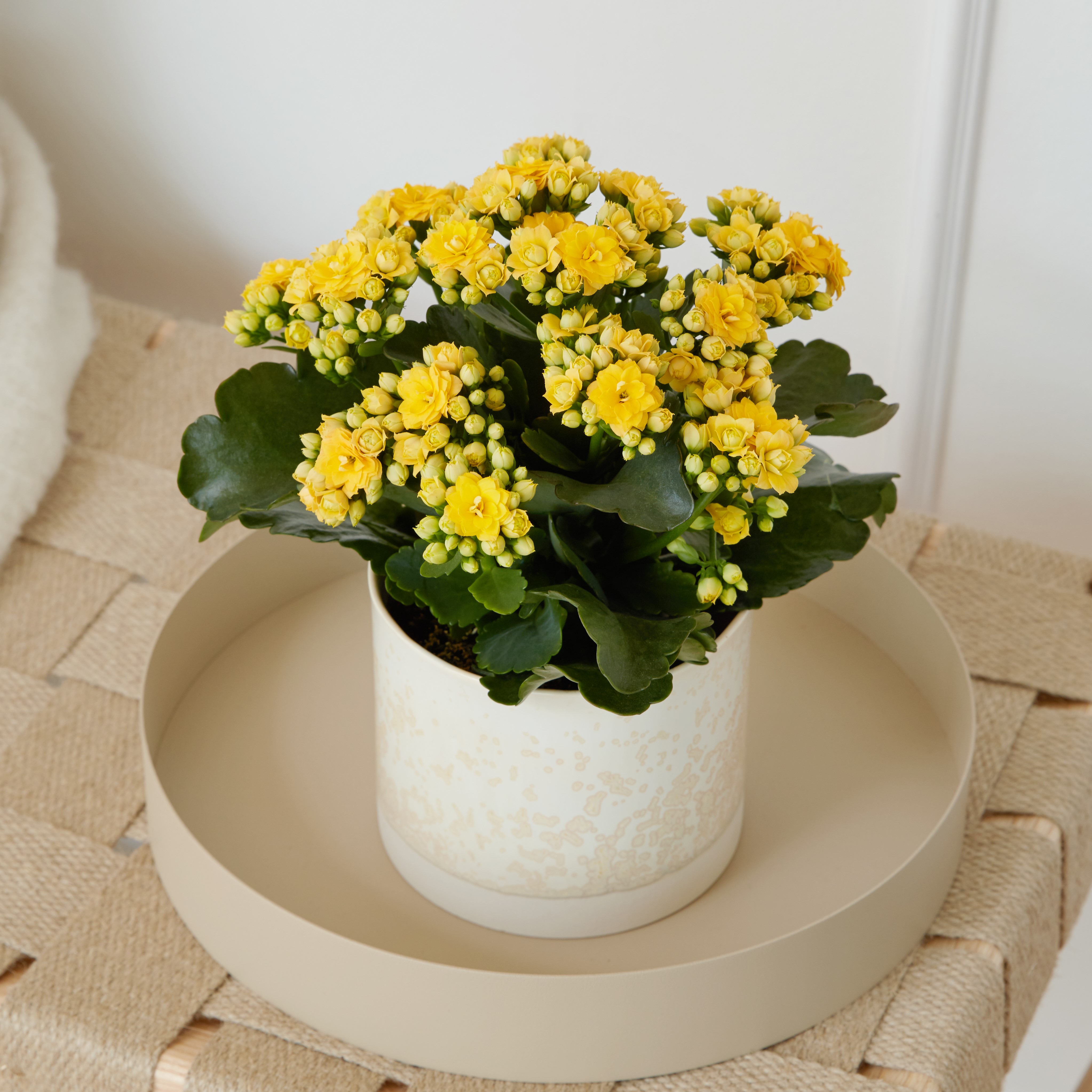 Our beautiful 10.5 cm double-flowering kalanchoe potted plants in white are delivered in packs of 8. It is a long-lasting indoor plant of medium size that blooms beautifully for at least 6 weeks. It is easy to care for, can be placed anywhere in the home and can withstand both sun and shade. The plant is 24-26 cm in height and the pot is 10.5 cm in diameter. The flowerpot is not included with the plant.